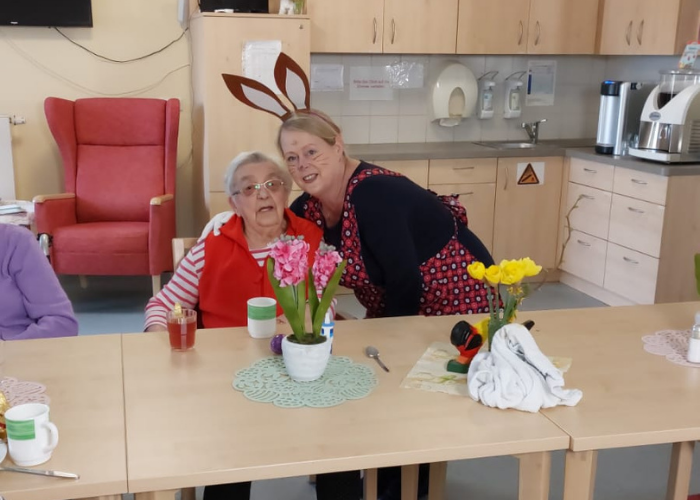 Zu Kaffee und Kuchen feierten unsere BewohnerInnen gemeinsam das Osterfest. Unsere zwei fleißigen Häsinnen Ramona und Birgit überraschten die BewohnerInnen mit liebevoll gestalteten Osterkörbchen.