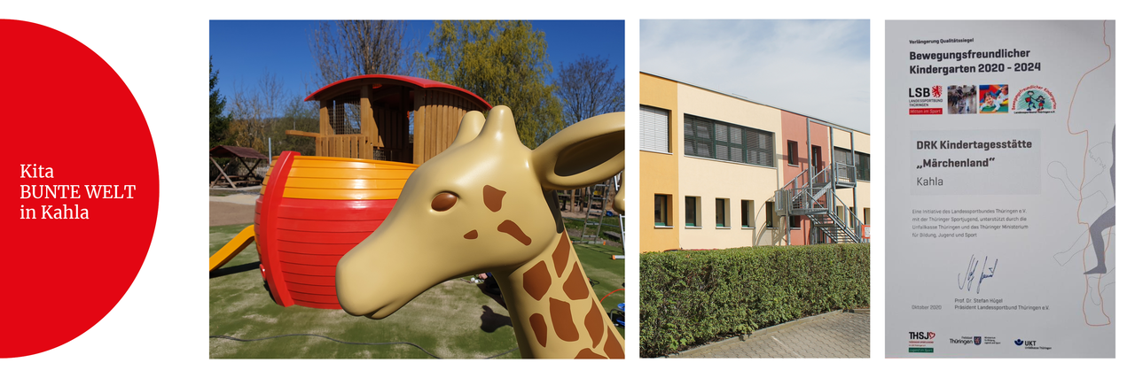 Die integrative DRK-Kita BUNTE WELT (ehemals Märchenland) liegt zentral in Kahla mit Blick auf die Leuchtenburg und ist bequem mit öffentlichen Verkehrsmitteln zu erreichen. Hier werden max. 80 Kinder mit und ohne Integrationsbedarf im Alter von einem Jahr bis zur Einschulung von einem multiprofessionellen Team aus acht pädagogischen Fachkräften zwischen 6.00 und 17.00 Uhr liebevoll betreut und individuell gefördert.