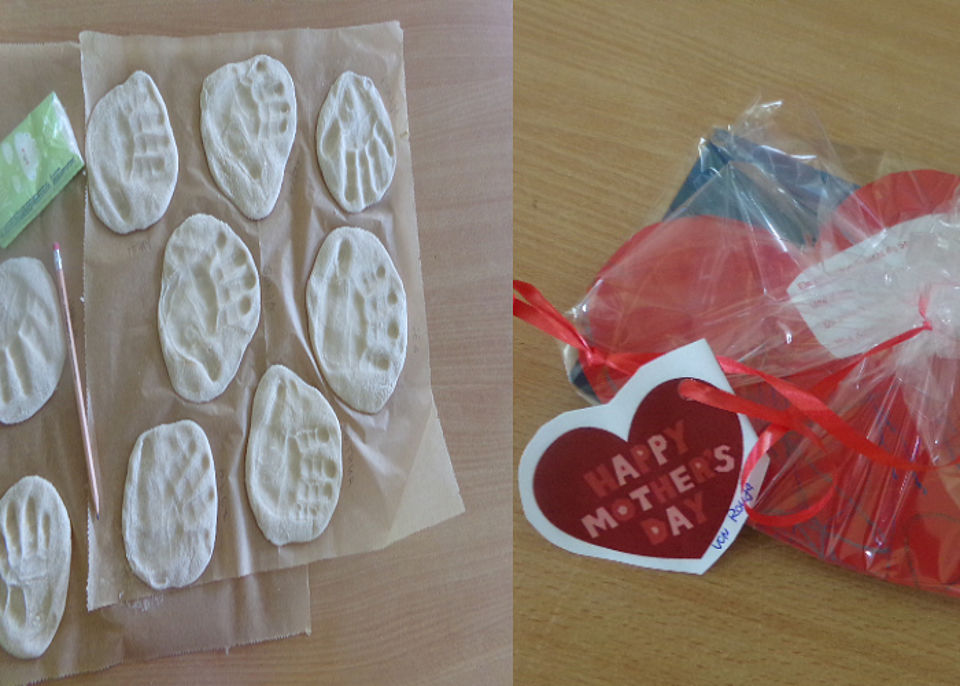Hammer in die Hand und druff auf den Nagel. Schere ansetzen – schnipp, schnapp. Mehl, Salz, Wasser, Öl vermischen und Hände her: Mit liebevoller Akribie kneteten, werkelten und bastelten die Wirbelwinde zum Mutter- und Vatertag, um ihren Eltern eine kleine Freude zu bereiten. Die Ergebnisse in Form von Holz-Nagel-Herzen, Salzteigabdrücken und selbstgebastelten Karten waren ein wunderbares Symbol ihrer Liebe Ausdruck zu verleihen.