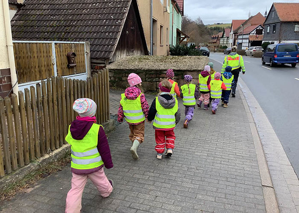 Dann kam der Winter mitsamt seiner kühlen aber auch schnee-bringenden Temperaturen zurück. Voller Freude und winterlicher Energie tobten sich die kleinen Wirbelwinde auf der festgewordenen Schneedecke mit Schneeballschlachten aus und machten den Hang mit ihren Schlitten unsicher. Der Schnee war noch nicht ganz geschmolzen, da wurden auch schon die Warnwesten geschultert, denn die Verkehrserziehung stand an. Unter Anleitung der Polizeiinspektion Stadtroda wurden die teilnehmenden VorschülerInnen geschult und konnten die anschließende Verkehrsprüfung mitsamt selbstständiger Straßenüberquerung meistern.