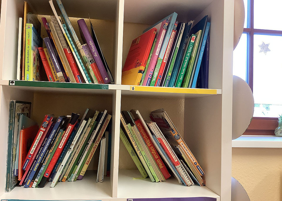 Und dann widmeten wir uns weiter unserer Kinderbibliothek. Nach dem Sortieren und Reparieren der Bücher sowie unseren erarbeiteten Grundsätzen standen weitere Aufgaben an. Gemeinsam mit den Kindern legten wir sieben Kategorien inklusive passender Farbwahl fest, nach denen wir unsere Bücher sortiert haben. Und damit auch jedes Buch seinen Platz in der dazugehörigen Kategorie finden konnte, beklebten wir sämtliche Bücher mit den passenden Farbpunkten. Doch fertig sind wir noch nicht, es bleibt also spannend.