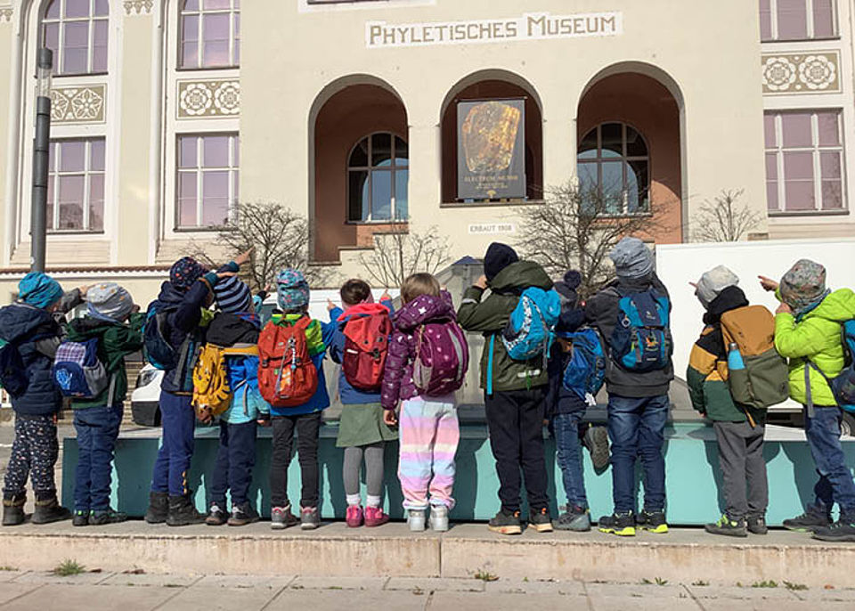 Im Phyletischen Museum nahmen die Kinder an einer Expedition in die Tiefsee teil. Gemeinsam mit Qualle Emma tauchten die Kinder ab und lernten verschiedene Lebewesen wie den Seeigel und Korallen kenne. Das Highlight stellt die Barte eines Grönlandwales dar. Zum Abschluss konnten die kleinen Entdecker das gesamte Museum intensiv in Augenschein nehmen.