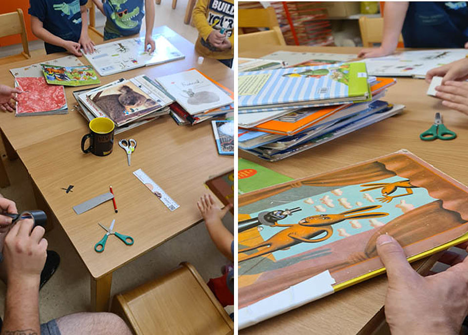 „Warum sind eigentlich so viele Bücher kaputt? Das ist doch doof!“ Diese Frage-Aussage nahmen wir zum Anlass, unsere Kita-eigenen Bücher einer Reparaturkur zu unterziehen und zudem unsere Einstellung zum Thema ´Literatur´ zu hinterfragen. Gemeinsam mit den Kindern entwickelten wir acht Grundsätze, nach denen wir unsere Bücher nutzen. Doch damit nicht genug: Obwohl der Sommer noch im vollen Gange war, verwandelte sich unser Kindergarten in eine Bücherwerkstatt. Die Wirbelwinde sortierten kaputte Bücher aus, arbeiteten mit einer Menge Feingefühl, konnten über 50 Bücher reparieren und sie so vor der Mülltonne bewahren. Damit war die Bücherthematik jedoch nicht abgeschlossen – doch dazu gibt es im Oktober mehr Neuigkeiten.