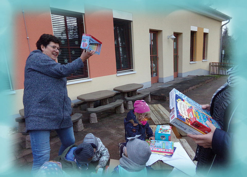 Und was die Kinder nicht alles für tolle Sachen aus dem Karton herauszogen: ganz viele bunte Stifte, Bastelmaterial, Brett- und Kartenspiele, Puppen, Autos, Straßenkreide und Doktorsets. Das war wirtklich großartig für Klein und Groß.