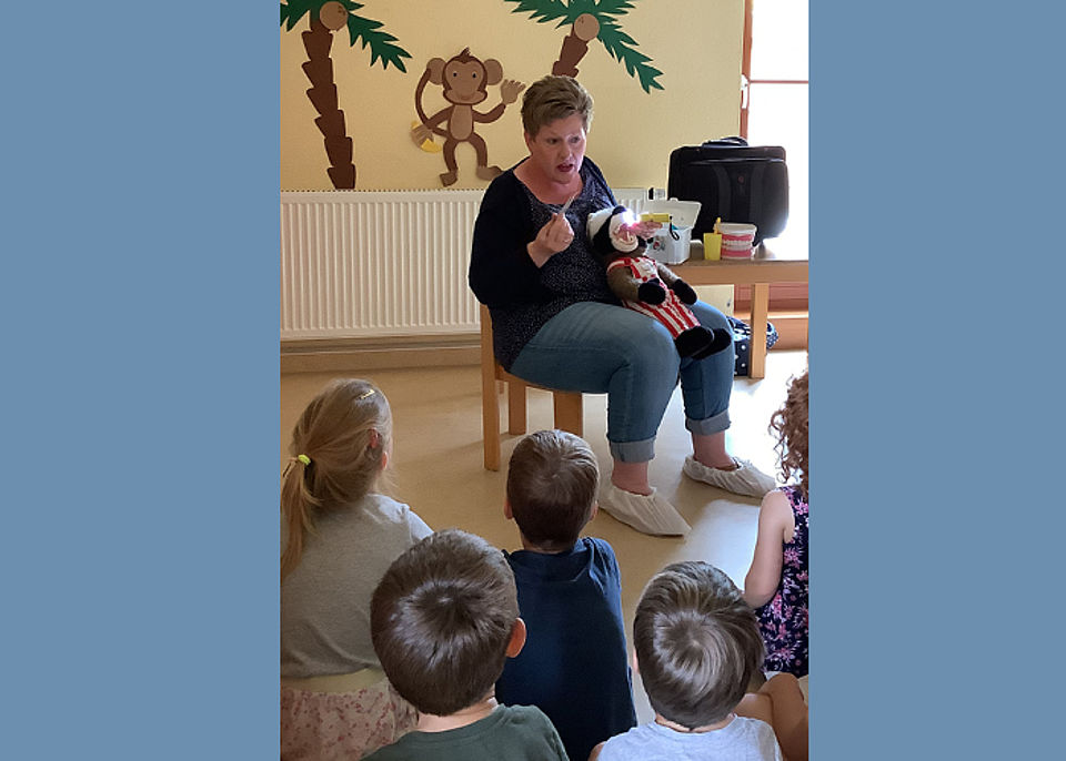 Hurra, die Zahnputzschwester war da! Mit einer Menge Utensilien im Koffer und noch mehr Wissen über die Zahnpflege im Schlepptau besuchte uns Schwester Christiane. Um alle Kinder bestmöglich auf den Zahnarzt/ die Zahnärztin einzustellen und etwaige Ängste zu nehmen, präsentierte sie den Kindern Mundspiegel sowie Pinzette, Wattebausche und sogar einen Bohrer. Im Anschluss putzten alle Kinder gemeinsam von Rot nach Weiß, führten die Bürsten im Kreis und strahlten am Ende bis über beide Ohren.