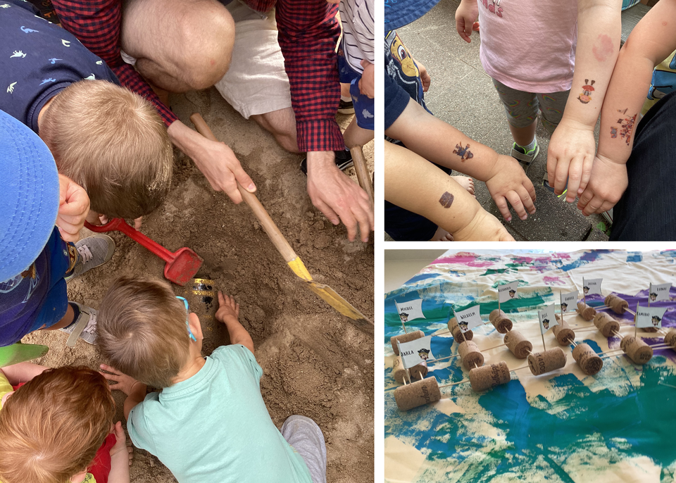 Aufgepasst, hier kommt die Wilde Wirbelbande! Bei unserem Piratenprojekt haben wir spannende Geschichten gehört und herausgefunden, warum auch Mädchen in eine Piratenbande gehören. Wir haben eine eigene Piratenflagge gemalt, Floße aus Korken gebaut und zu Wasser gelassen, ein piratiges Buffet genossen und uns auf eine abenteuerliche Schatzsuche begeben.