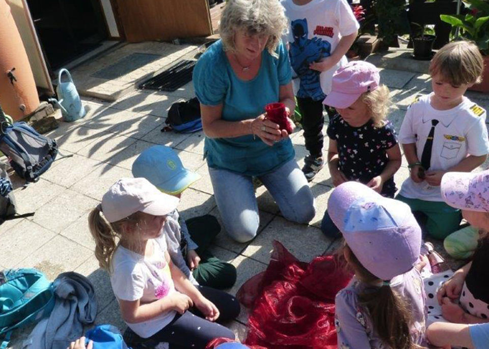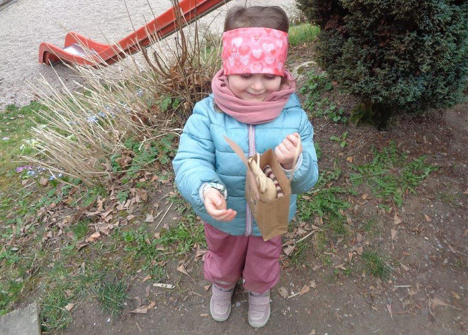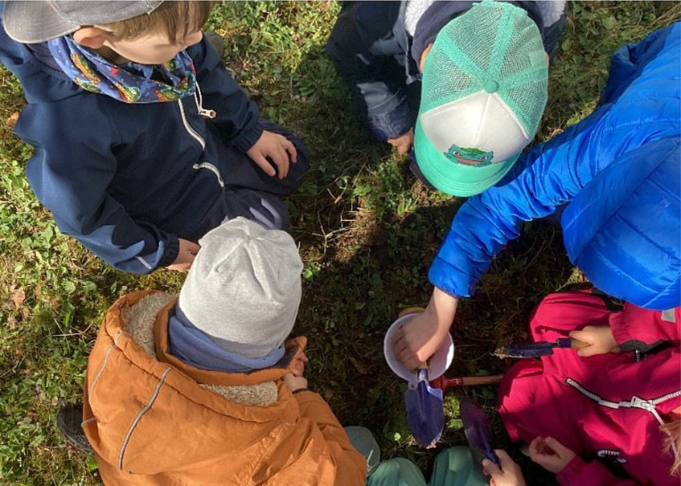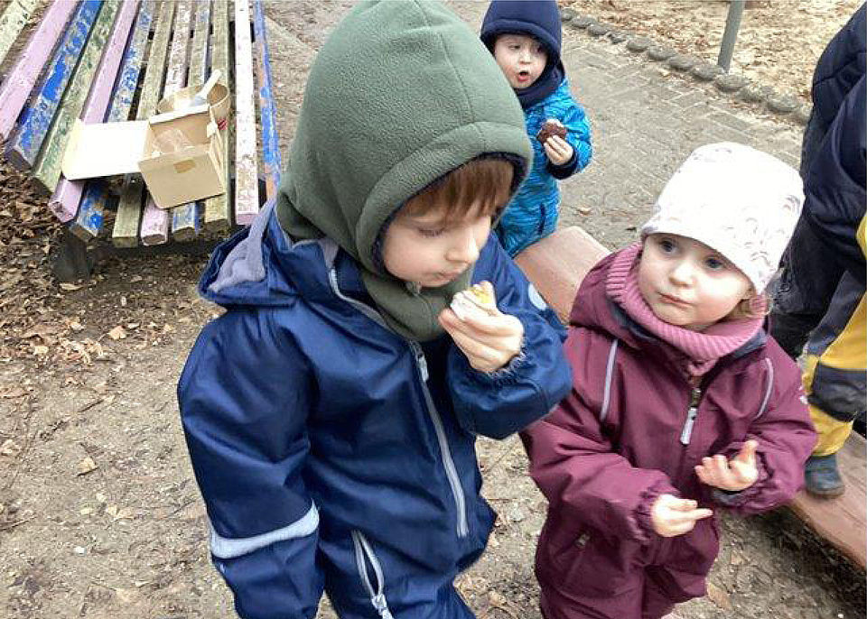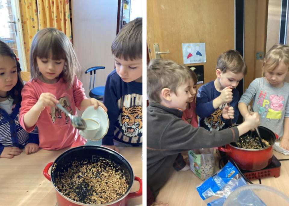 Mit Fett und vielen Samen sowie Vogelkörnern bereiten wir Meisenknödel zu. Danach hängen wir sie überall im Bummi-Garten auf und beobachten gemeinsam die Vögel bei ihrer Mahlzeit.