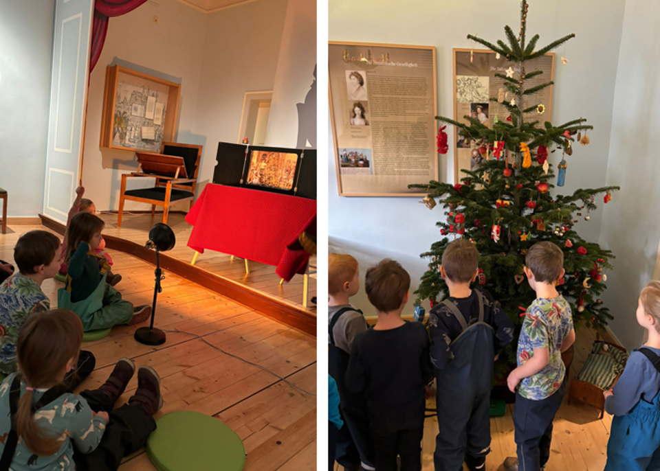 Am 3. Dezember waren die Kinder im Romantikerhaus zu Gast. Dort erhielten wir Einblick in die Zeit der Romantik mit Gedichten und Märchen zu den Themen Natur und Liebe. Uns wurde das Märchen von E.T.A. Hoffmann „Der Nussknacker“ in Musik und Sprache dargeboten. Nun suchen alle Kinder den geheimen Eingang durch die Standuhr ins Zuckerland.