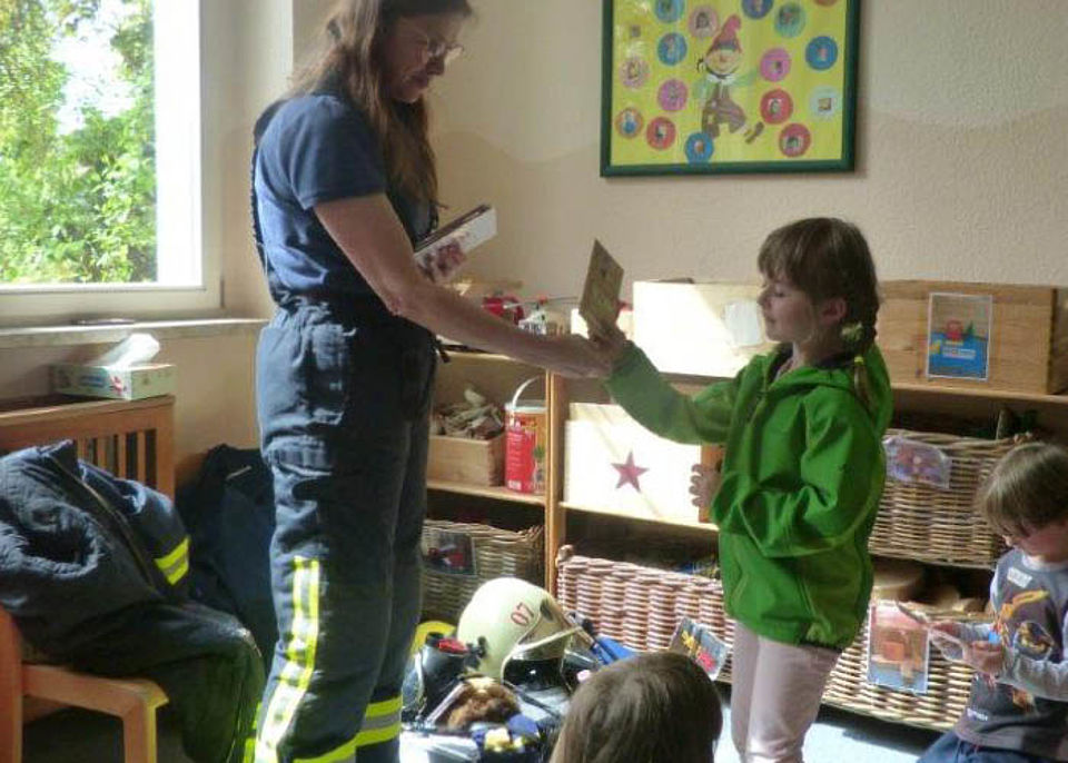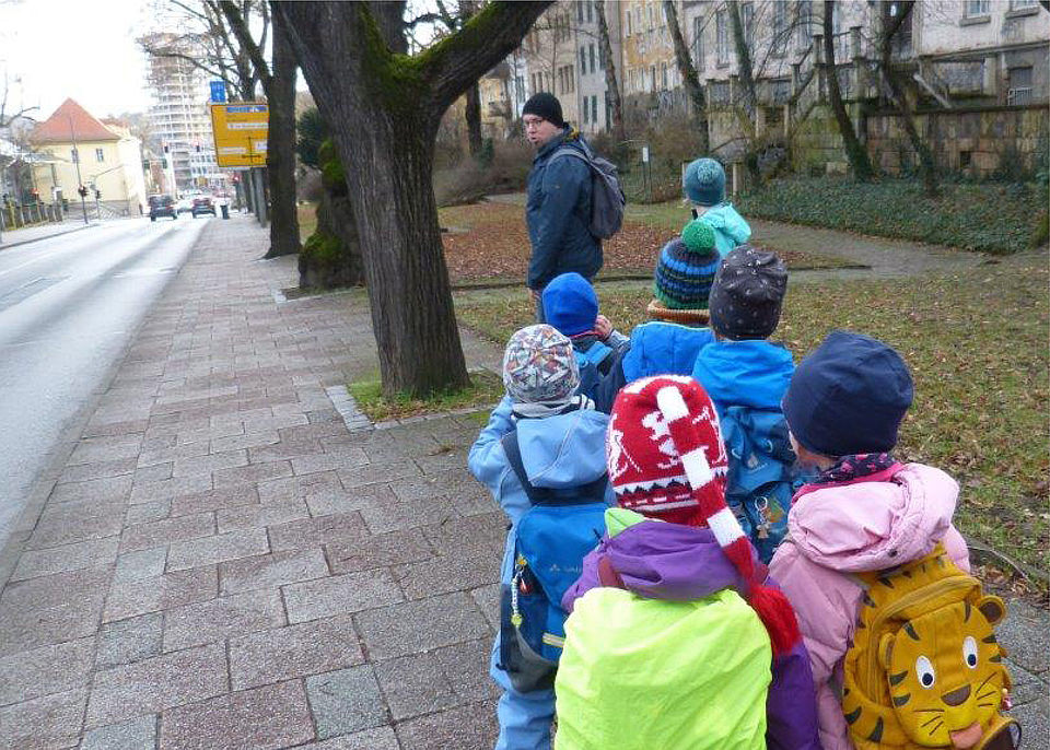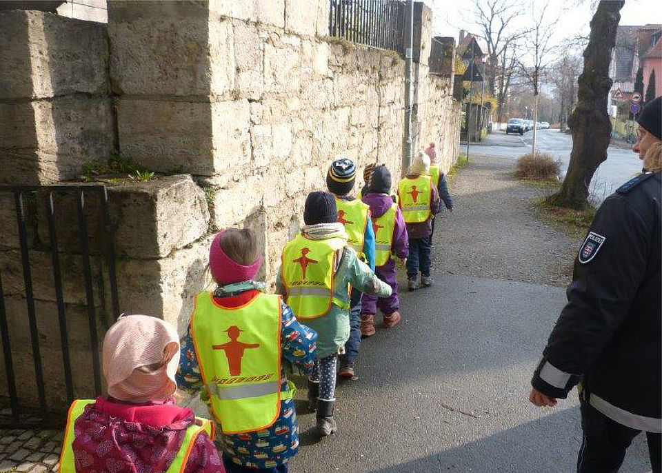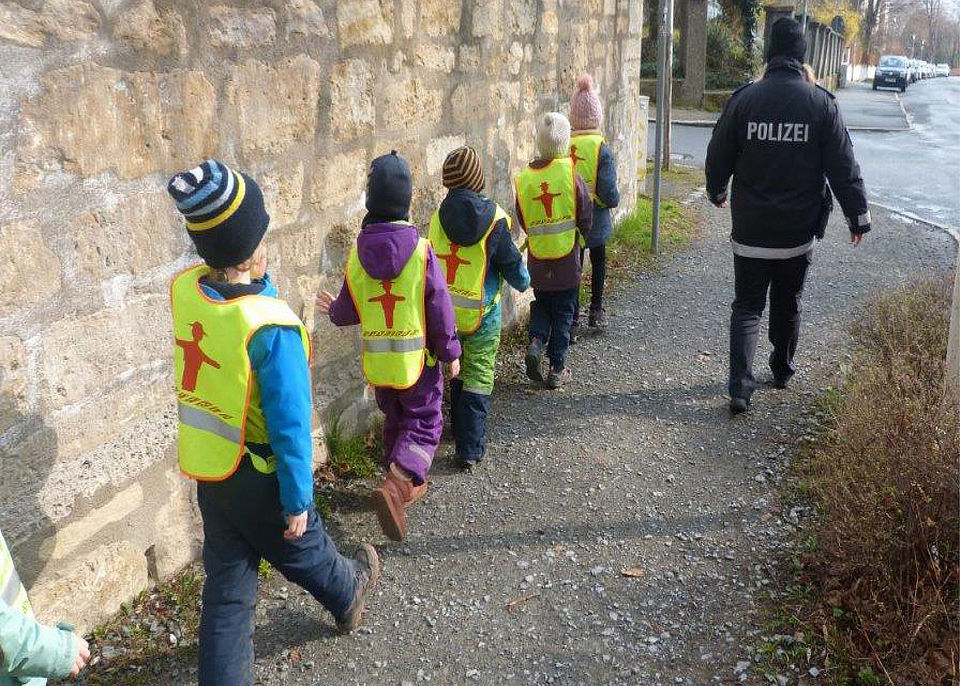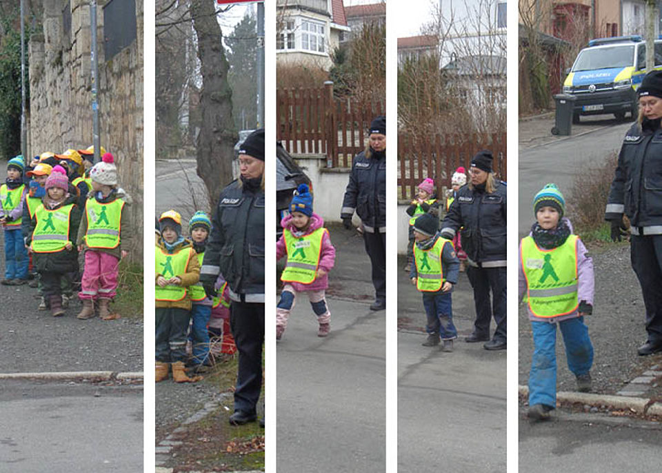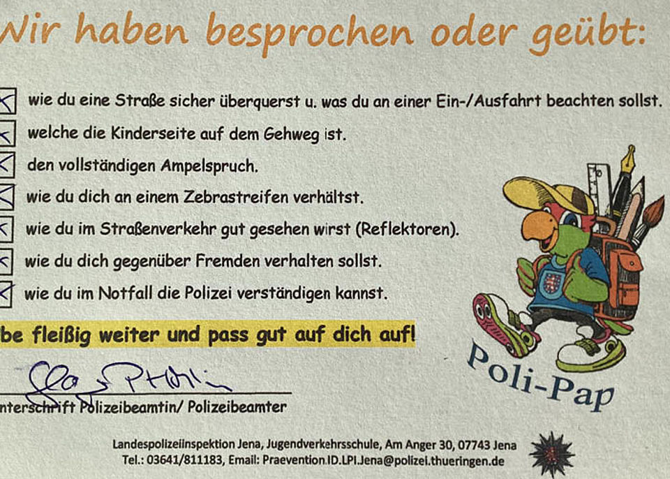 Auch in diesem Jahr werden alle Kinder des letzten Kindergartenjahres von der Polizei zum Thema Verhalten im Straßenverkehr geschult. Die Lerneinheit besteht aus einem theoretischen Training und einer Übung im öffentlichen Straßenverkehr. Dieses Präventionsprogramm soll die Kinder zu einem umsichtigen Verhalten als Fußgänger sensibilisieren. Alle Kinder haben aufmerksam und ausdauernd zugehört und die Wichtigkeit des korrekten Verhaltens im Straßenverkehr wahrgenommen. Es war aufregend, allein zwischen parkenden Autos über die Straße zu gehen! Nun sind wir alle geprüfte Fußgänger und tragen unsere Urkunde mit Stolz.