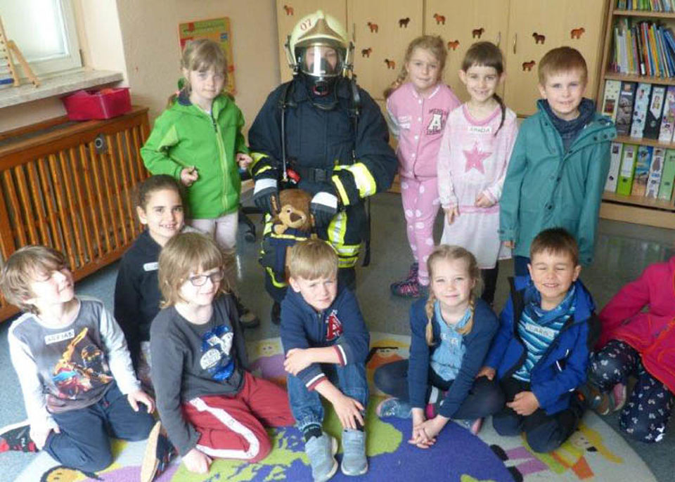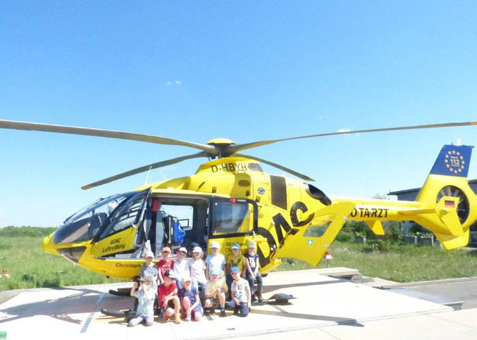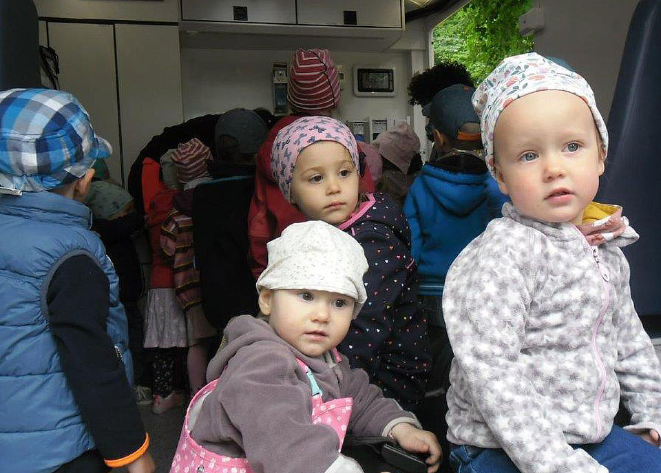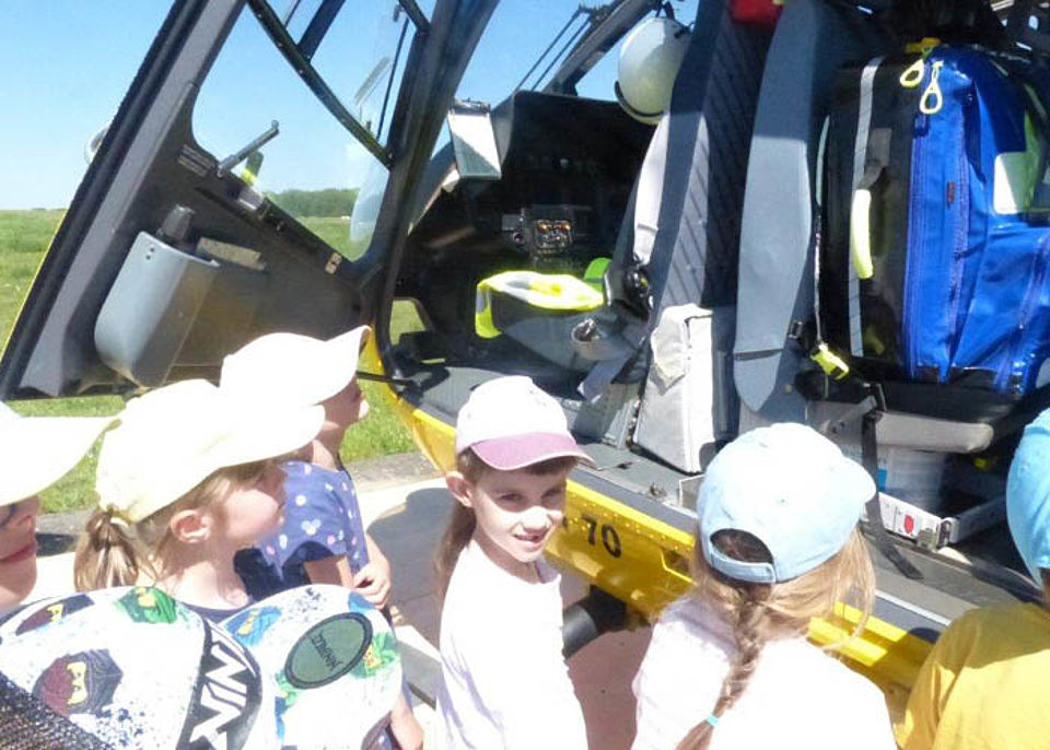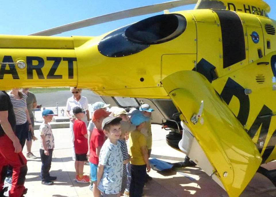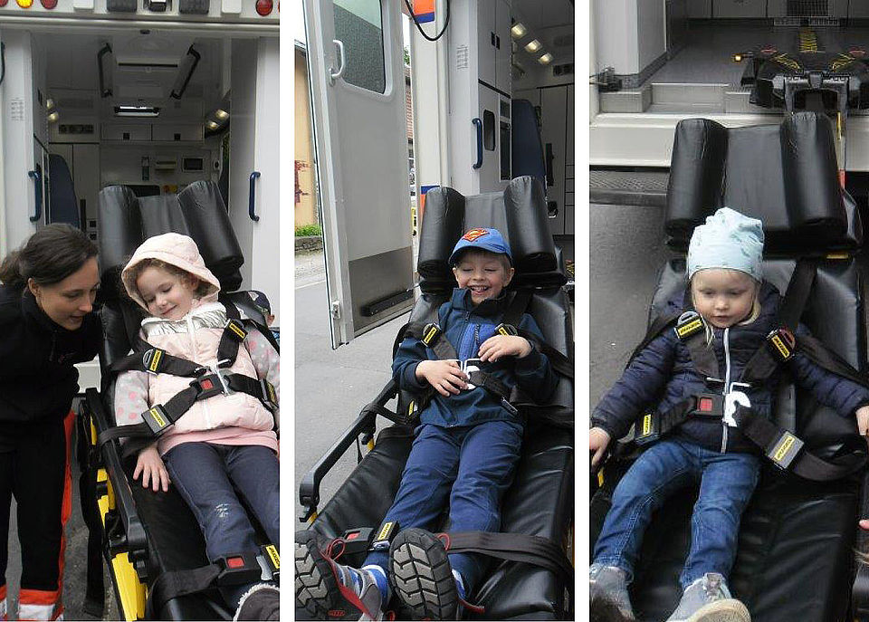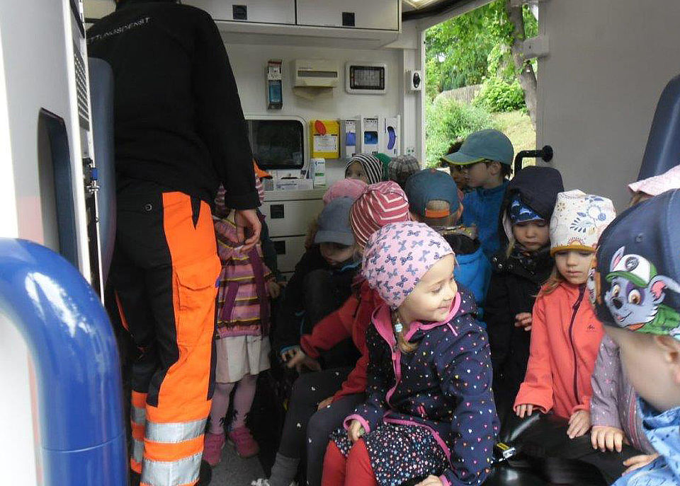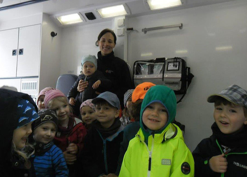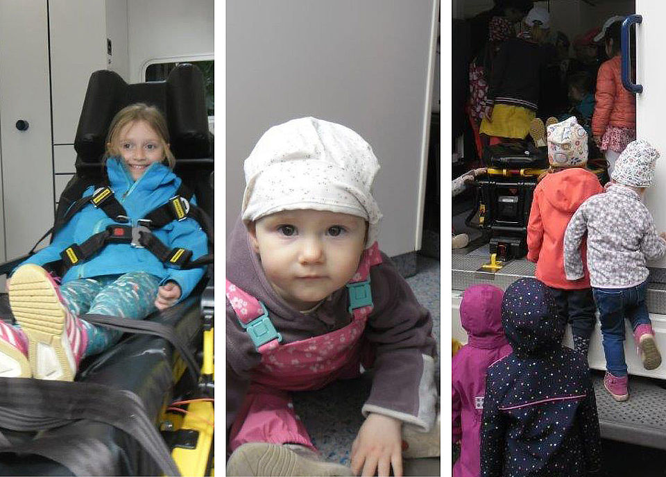 Die Kinder bekamen erklärt, was sich dort drin alles befindet, um bei verunfallten Patienten schnelle medizinische Versorgung zu gewährleisten. Außerdem durften sich die Kinder mal auf die Trage legen und alles anfassen und bestaunen.