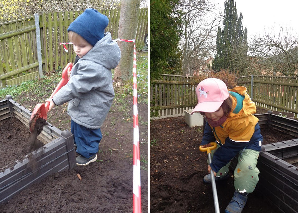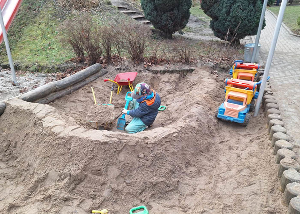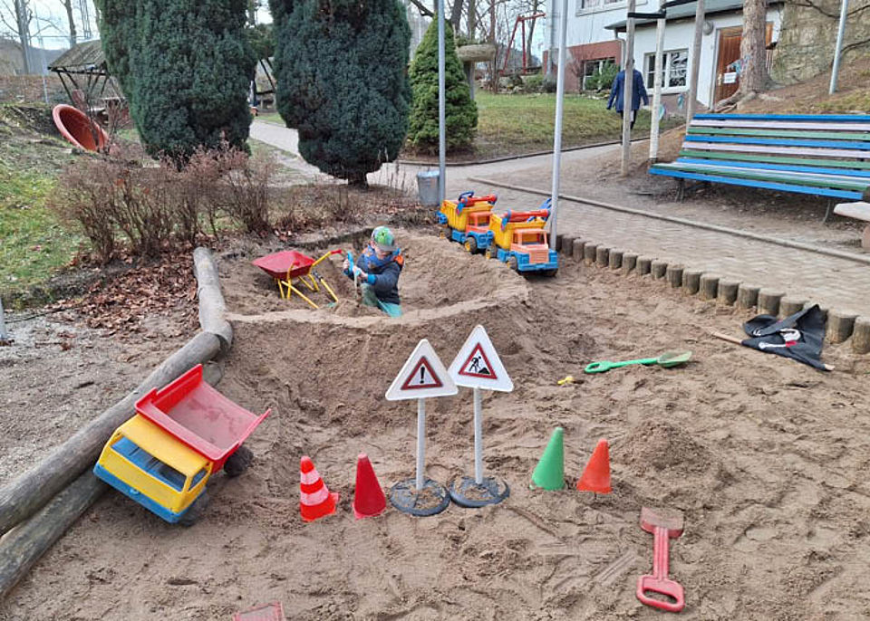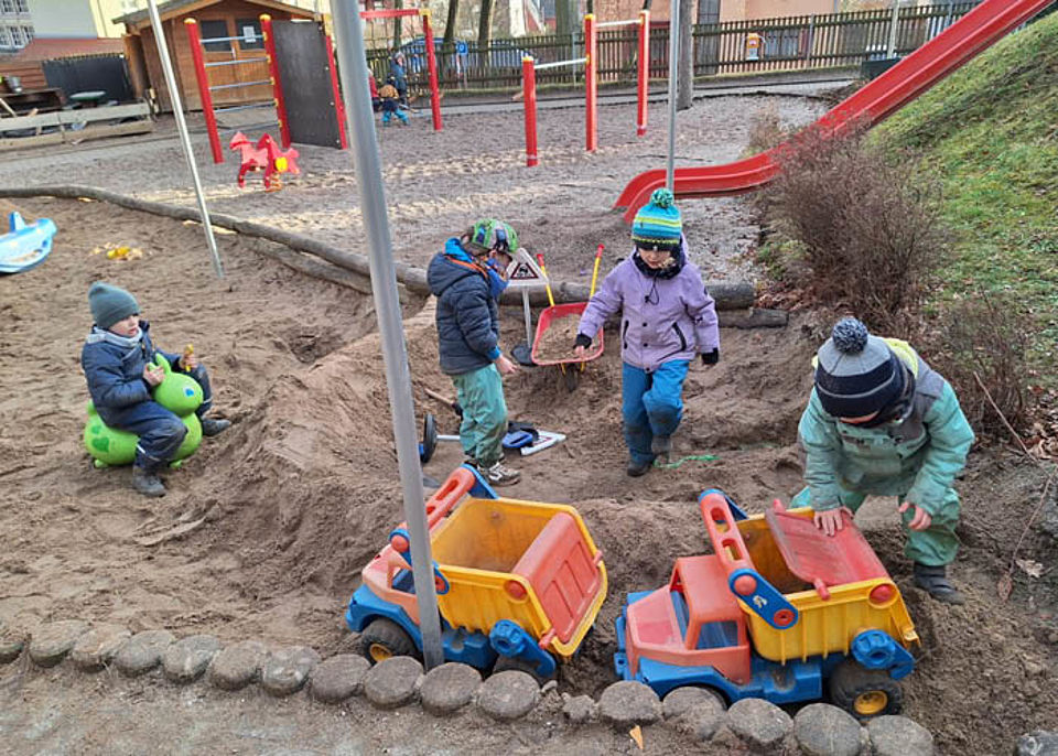 Trotz der niedrigen Temperaturen sind unsere Kinder regelmäßig an der frischen Luft. Die Tiefbauarbeiten ziehen sich jetzt schon die dritte Woche in der Sandkiste hin. Gemeinsam haben die Kinder gebuddelt, Sand in Laster umgeladen und von der Baustelle abtransportiert. Es ist eine dicke Mauer entstanden, die von allen Kindern bespielt werden kann. Es ist immer wieder erstaunlich mit welcher Energie und Ausdauer Kinder spielen!