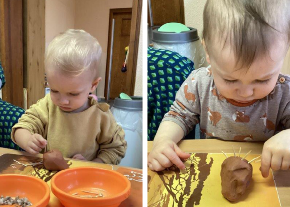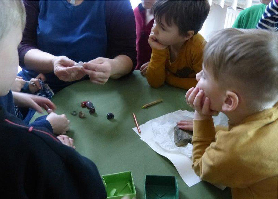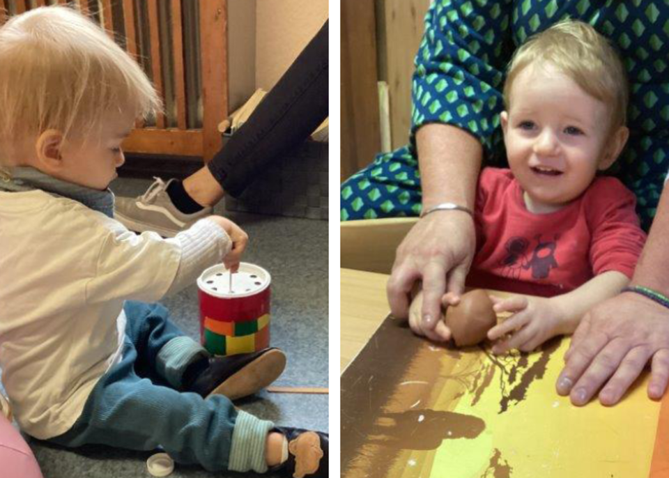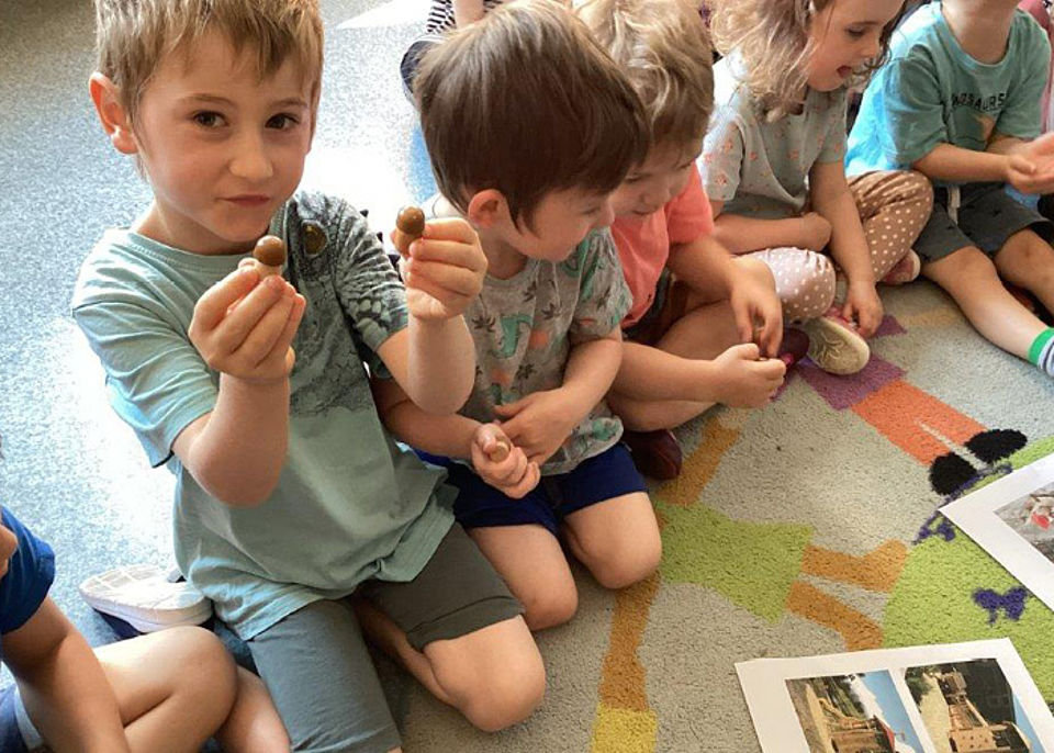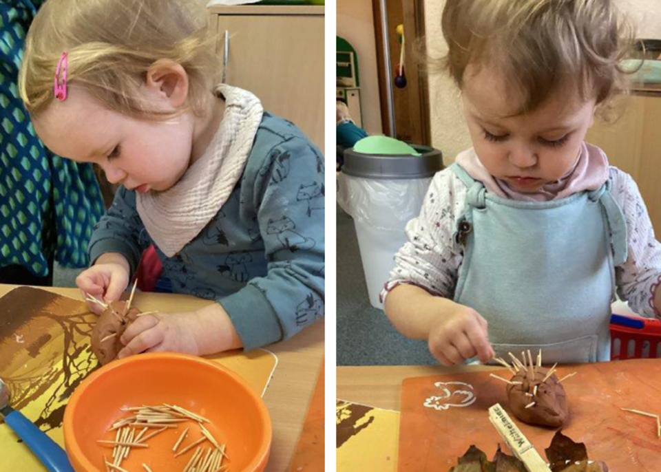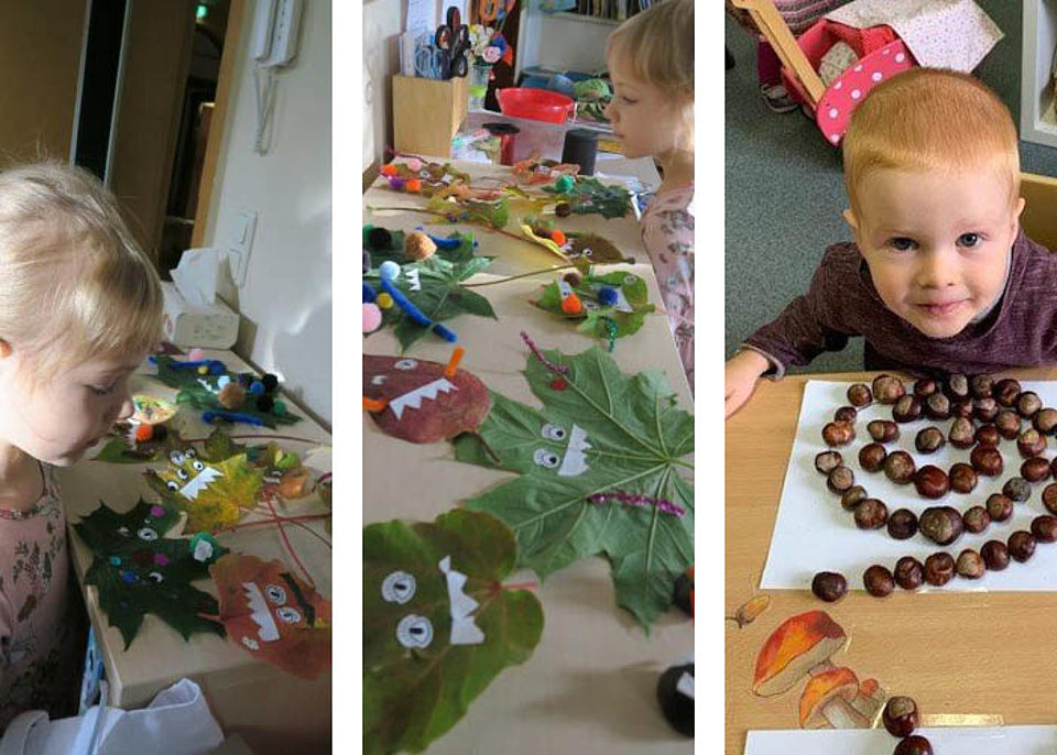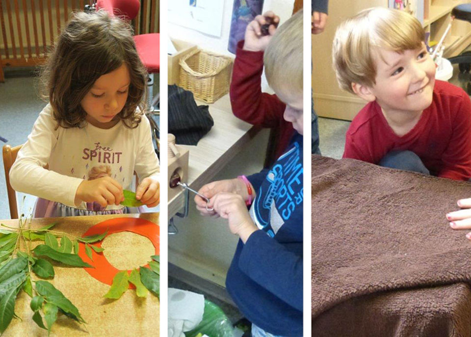 Da wurden Tast- und Fühlspiele rund um den Herbst erprobt. Durch die kleinen Hände wanderten Zapfen, Kastanien und bunte Blätter.