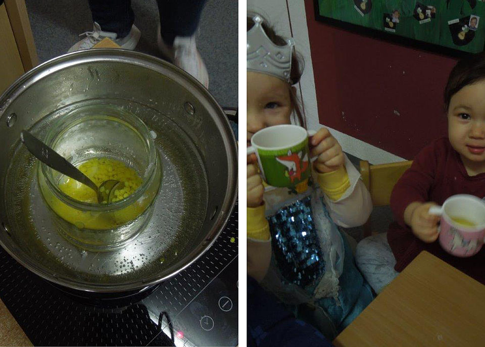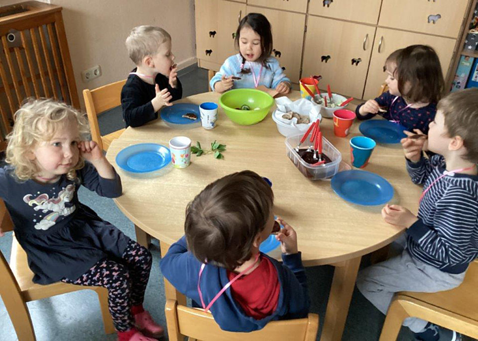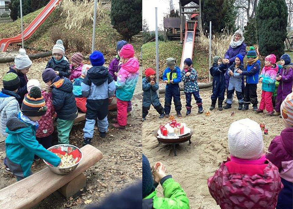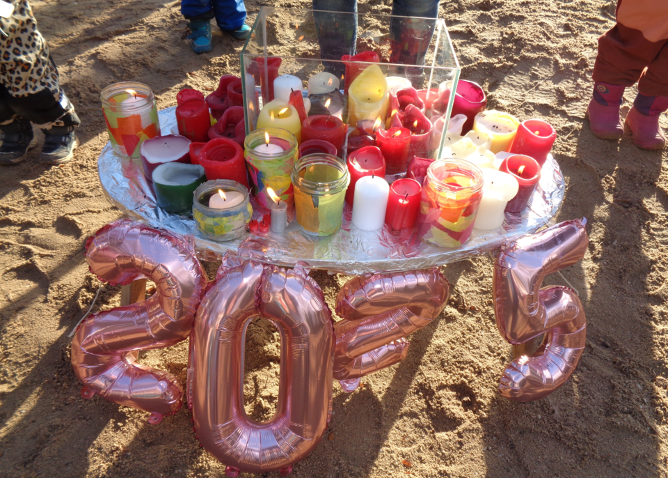 Alle Familien sind dazu aufgerufen, ihre Kerzenstummel und Keksreste aus der Weihnachtszeit in der Kita abzugeben. Dann werden alle Kerzen im Sandkasten entzündet, die Kekse in Schüsseln angeboten und alle Kinder und pädagogischen Fachkräfte kommen zusammen. Wir singen Lieder, lassen eine Rakete steigen und begrüßen gemeinschaftlich das neue Jahr.