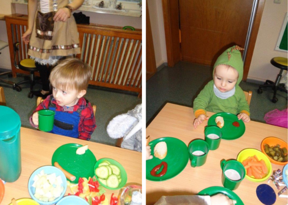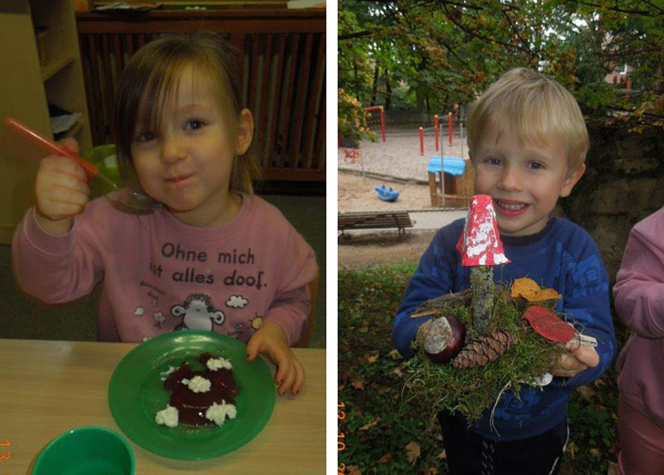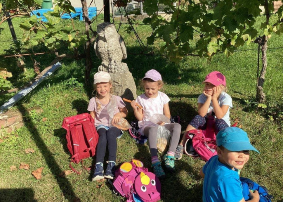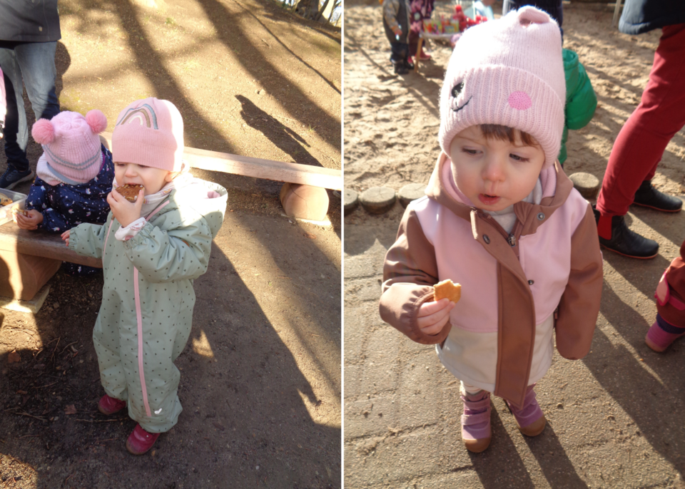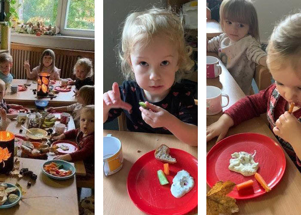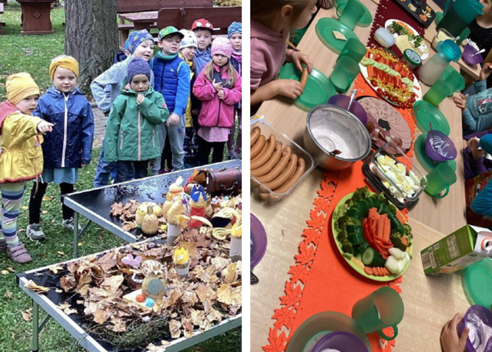 Das Fest startete mit einem gesunden und vitaminreichen Frühstück (Danke für die Unterstützung durch die Eltern!), dann haben die Kinder Herbstliches gebastelt und gemalt, und zum Abschluss wurde draußen im bunten Laub gesungen.