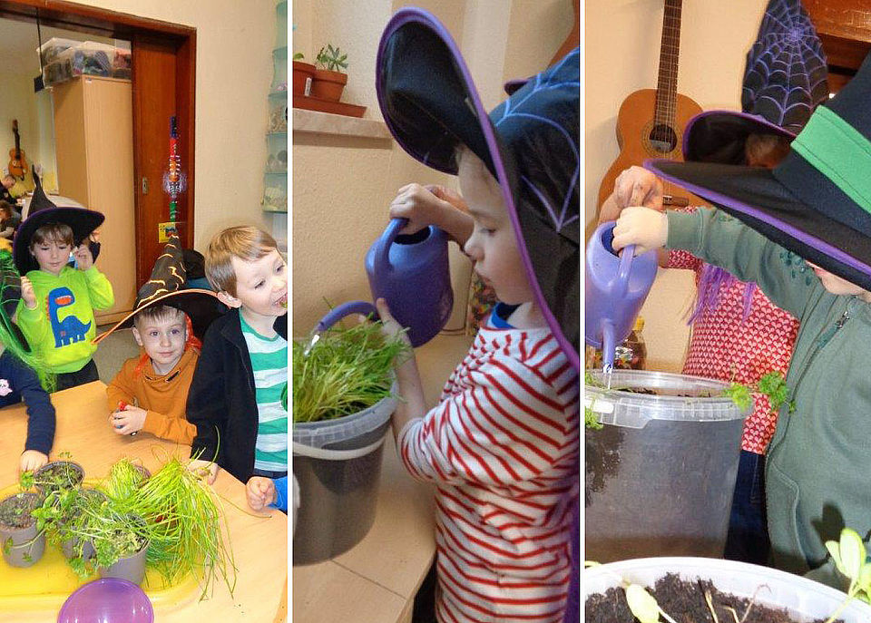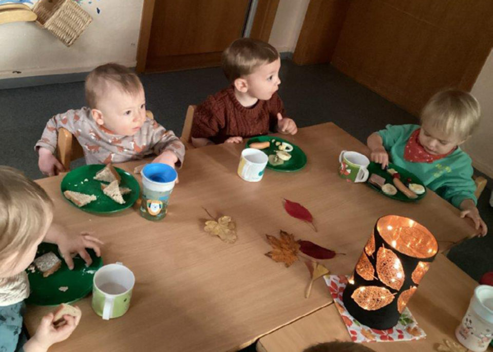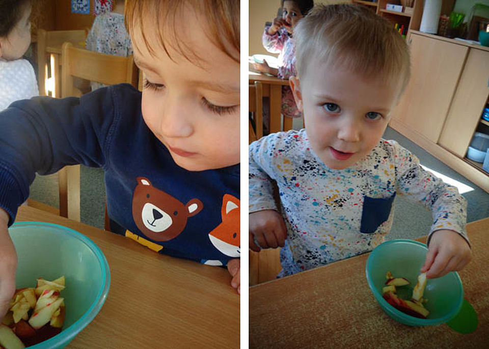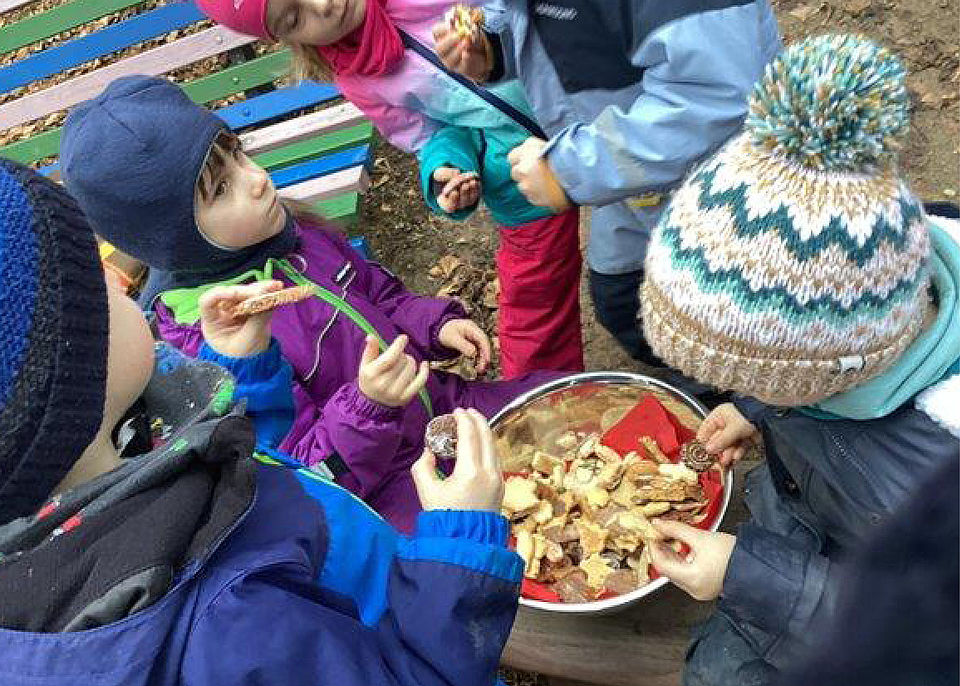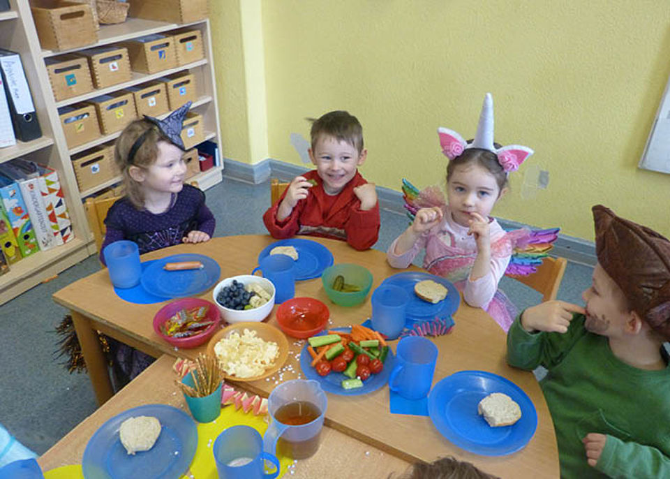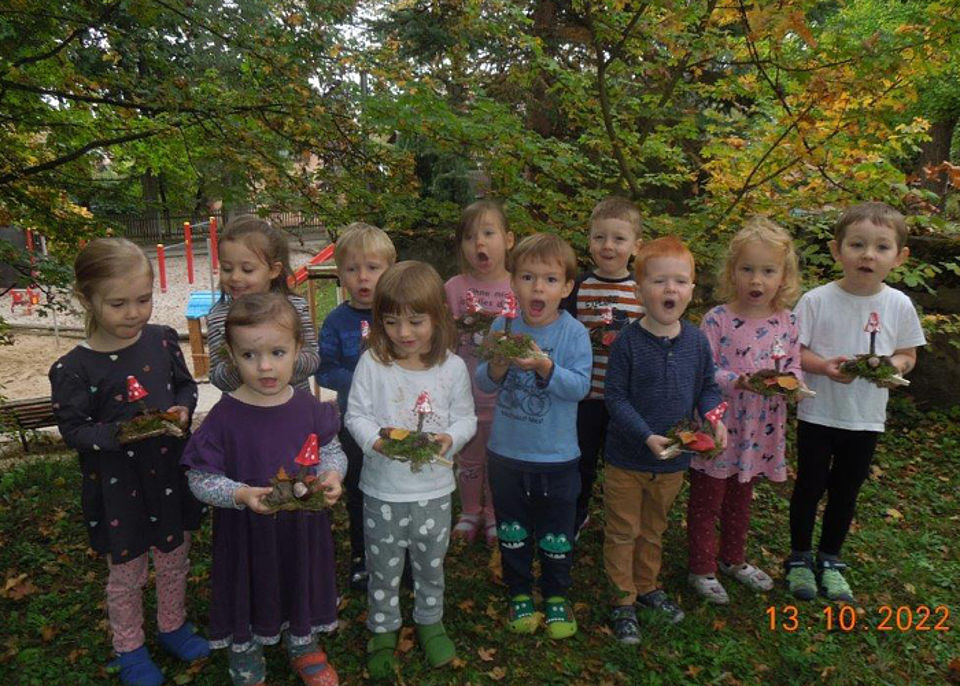 Das Fest startete mit einem gesunden und vitaminreichen Frühstück (Danke für die Unterstützung durch die Eltern!), dann haben die Kinder Herbstliches gebastelt und gemalt, und zum Abschluss wurde draußen im bunten Laub gesungen.