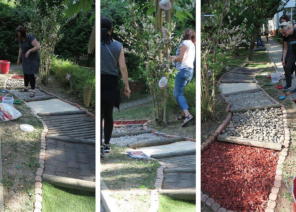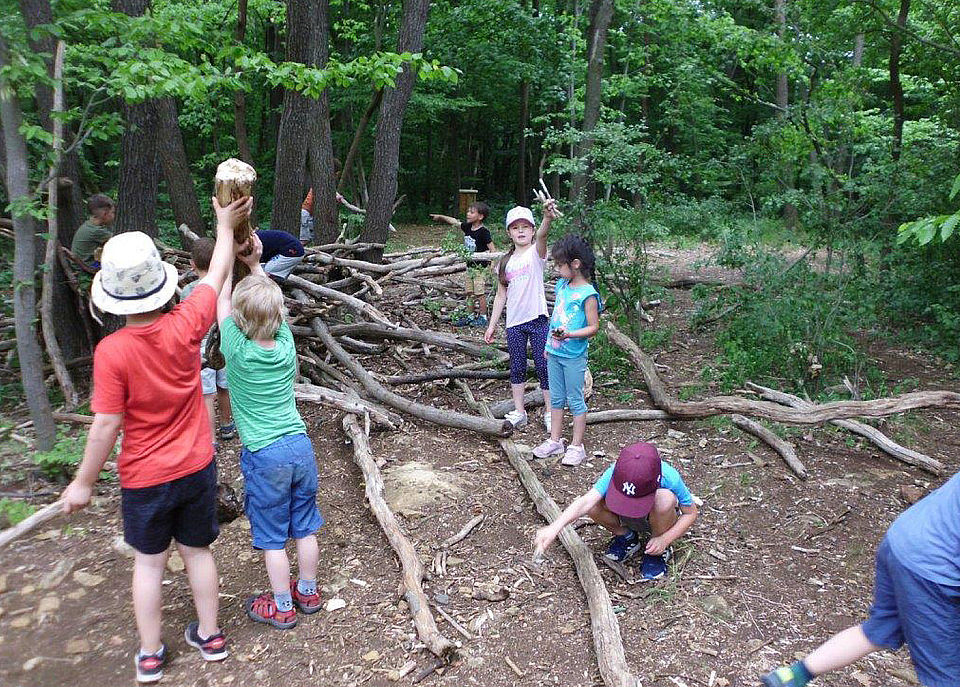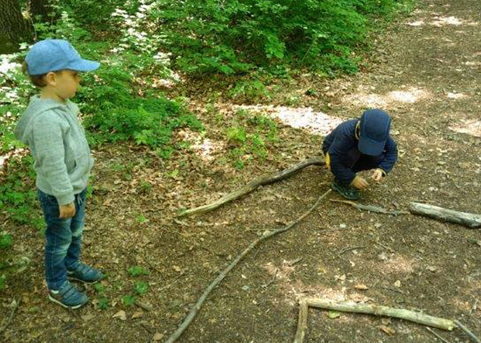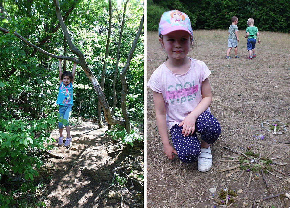 Nach einem stärkenden Picknick marschierten die kleinen Füße der Hasengruppe über den Fußfühlpfad auf dem Forst und gestalteten Mandalas aus verschiedenen Naturmaterialien. Mit Hilfe von Stöcken, Moos, Blüten und Steinen sind wunderbare Gebilde entstanden. Aus langen Baumstämmen und Ästen wurden Buden gebaut. Jeder packte mit an und wuchtete Ast für Ast auf einen großen Haufen, auf dem danach ausgiebig geklettert und Ausschau nach neuem Baumaterial gehalten wurde.