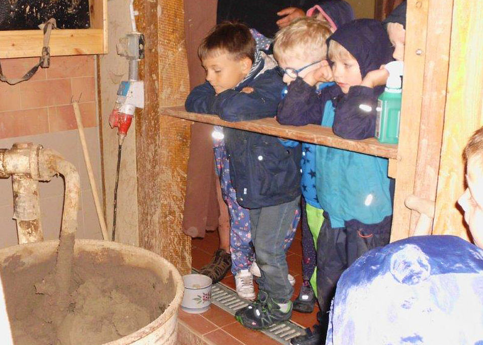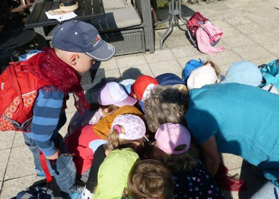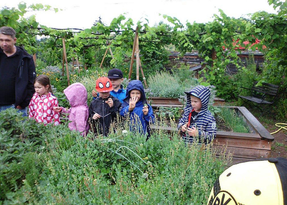 Nach kurzer Stärkung mit Nudeln, Wiener und Salat erwartete unsere Vorschulkinder eine kleine Hofführung. Zu Bestaunen gab es neben einer Lehmmischmaschine und einem Lehmbad, den hauseigenen Kräuter- und Gemüsegarten inkl. Kostprobe. Besonders beeindruckend und sicherlich auch ein bisschen furchteinflößend war der übergroße 30 Meter lange Lindwurm mit seinen leuchtenden Augen und seinem rauchspuckenden Maul. Die kleinen Meerschweinchen des Hofs genossen am diesem Tag besonders viele Streicheleinheiten.