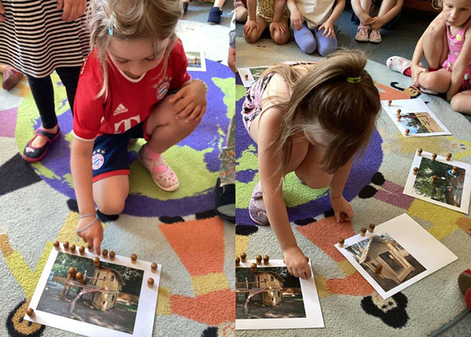 An unserem ?-Tag sind alle Kinder zusammengekommen und dazu aufgefordert worden, sich an einer Abstimmung zu beteiligen, wie der Außenbereich im neuen Kindergarten gestaltet werden soll. Zu Beginn wurden Bilder von möglichen Spielgeräten in der Runde vorgestellt und auf dem Boden vor den Kindern platziert. Die Kinder hatten die Zeit sich über die Spielgeräte auszutauschen. Danach bekam jedes Kind zwei Abstimmungs-Pilze. Nach einander hatte jedes Kind die Möglichkeit, die beiden Abstimmungs-Pilze auf die Spielgeräte zu stellen, die ihnen am meisten gefallen. Die Auszählung der Stimmen fand durch die Kinder selbst statt.