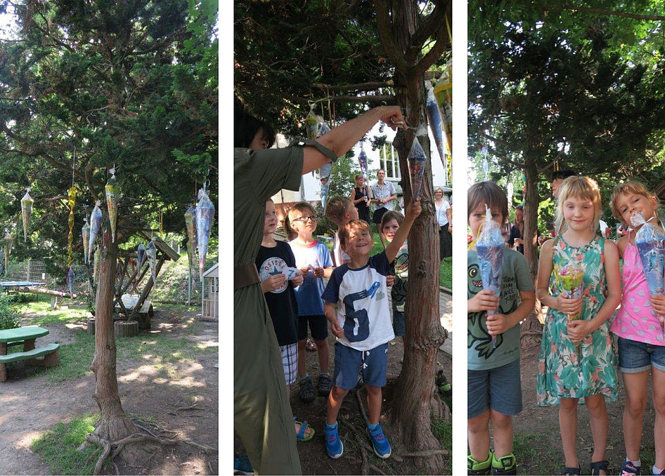 Das besondere Highlight des Festes war das Abnehmen der gewachsenen Zuckertüten. Seit die ersten warmen Strahlen im Frühling die Zuckertüten-Knospen haben sprießen lassen, konnten alle Kinder das stetige Wachstum der Zuckertüten beobachten. In diesem Jahr wuchsen genau 17 Zuckertüten für unsere Vorschüler am Zuckertütenbaum.