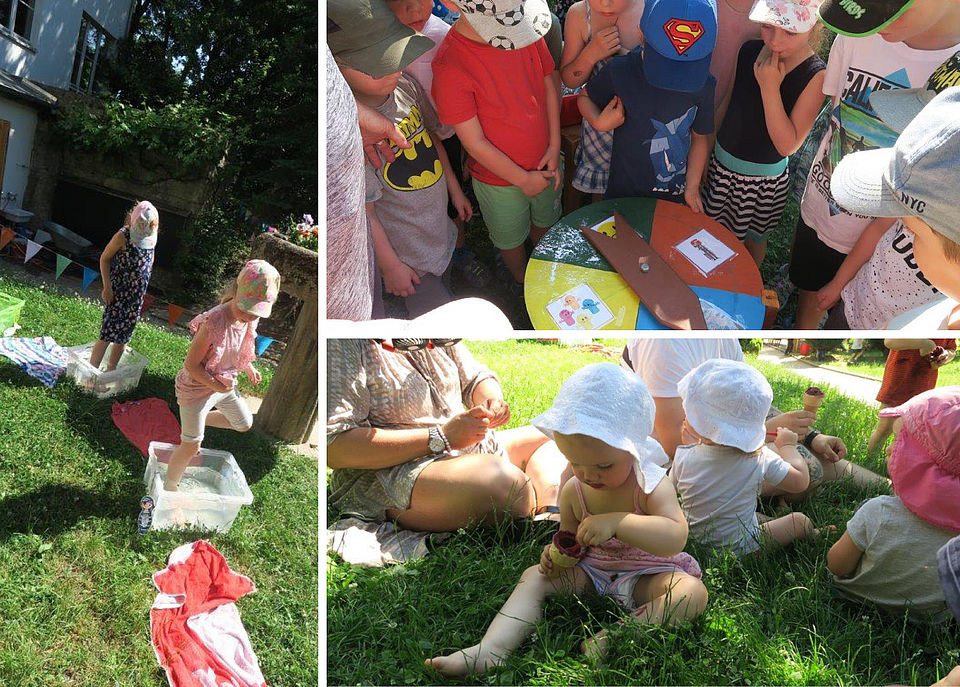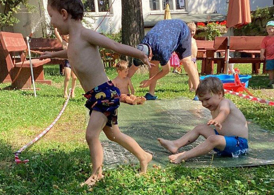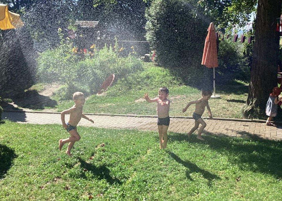 Im Garten wurde eine Seifen-Rutsche installiert. Mit Plane, Seife, Schrubber (zum Aufschäumen) und Wasser rutschten die Kinder über die Wiese. Eine weitere Möglichkeit ist den Gartenschlauch zu öffnen und eine spritzig-zarte Fontäne über das Gras zu sprenkeln und die Kinder können nach Lust und Laune darin rumtoben. Es ist uns wichtig den Kindern ein Angebot zu machen und wer an dem Tag möchte, kann daran teilnehmen.