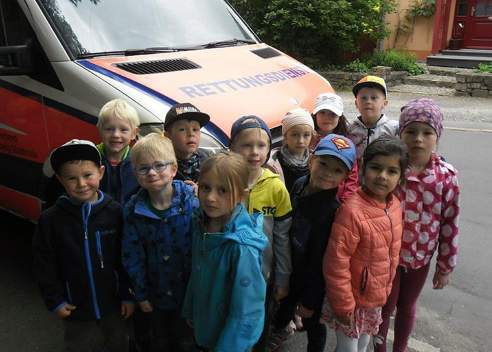 Was sie sonst nur in Spielzeuggröße kennen, stand heute in echt und nur für uns vor unserer Haustür: ein Rettungswagen des Deutschen Roten Kreuzes.
