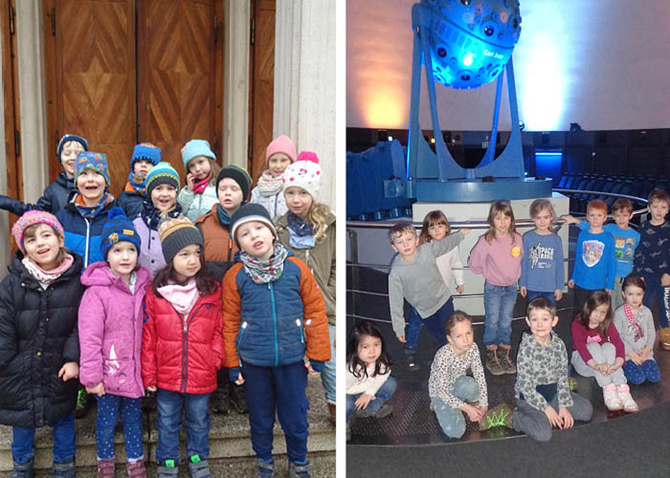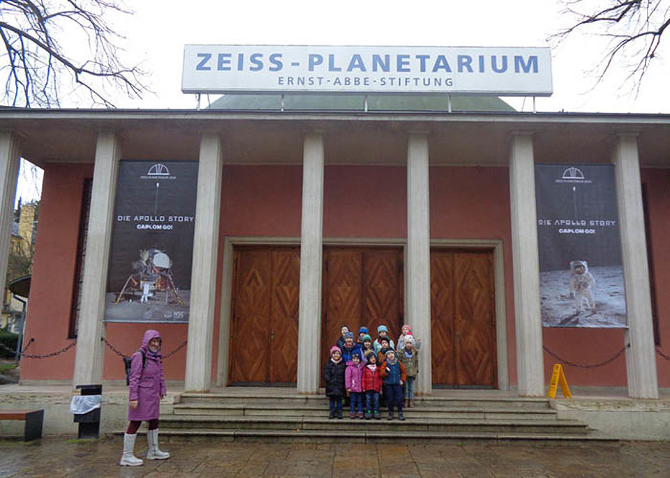 Vom Weihnachtsmann hatten die Kinder der Glühwürmchen-Gruppe einen Gutschein für das Planetarium überreicht bekommen. Darum konnten wir im Januar mit allen eine Vorstellung besuchen. Wir schauten das Programm „1x1 der Sterne“. Alle Kinder waren tief beeindruckt von der großen Kuppel und dem virtuellen Rundgang durch unsere Galaxis. Zu Beginn wurde ein Rundblick über Jena gezeigt, der schon zu vielen Gesprächen einlud. Mit dem Raumschiff zu den Nachbarplaneten der Erde zu fliegen, hat den Kindern die imposante Technik und Möglichkeiten von Computern auf eine neue Art nähergebracht. Wir danken dem Weihnachtsmann und den Mitarbeitern des Planetariums dieses Erlebnis ermöglicht zu haben.