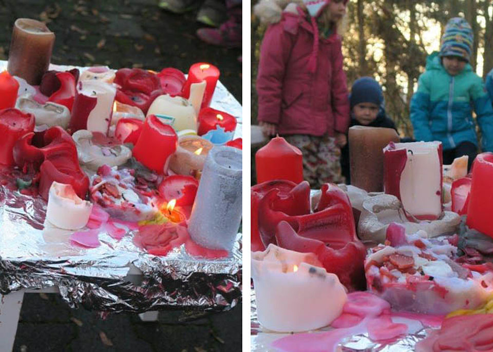 Traditionell werden Kerzenstummel auf einem Tisch heruntergebrannt, bis das Wachs ineinanderläuft. Das ergibt immer herrliche Bilder, Farben und Türme.