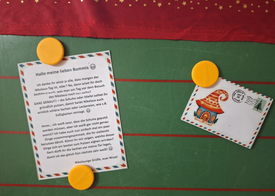 Auch zum Nikolaus treibt unser Wichtel Nisse mit Groß und Klein seinen Schabernack. Seine Spur quer durchs Haus ist unverkennbar. Bevor der Nikolaus kam, hat Nisse alle Schuhe der Kinder gesammelt, sie auf einen Haufen gelegt und schon alle Putzutensilien bereitgelegt. Der Nikolaus hat geputzte Schuhe vorgefunden und alle Kinder für ihre sauberen Schuhe belohnt.