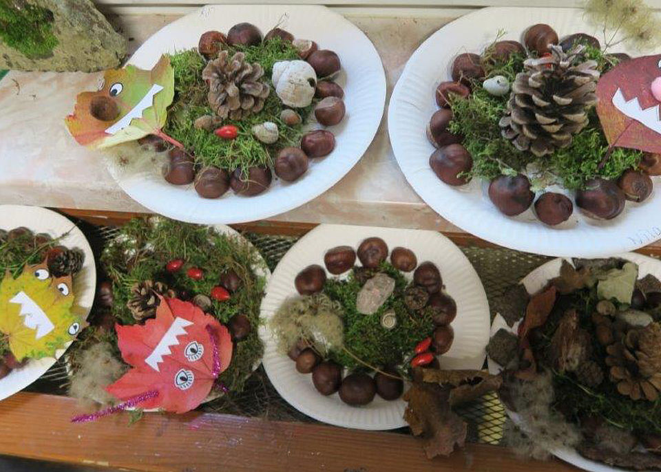 Diese Materialien waren aber auch prima zum Basteln geeignet. Es enstanden wunderschöne Türkränze, Herbstwindlichter und Spinnen aus Kastanien.