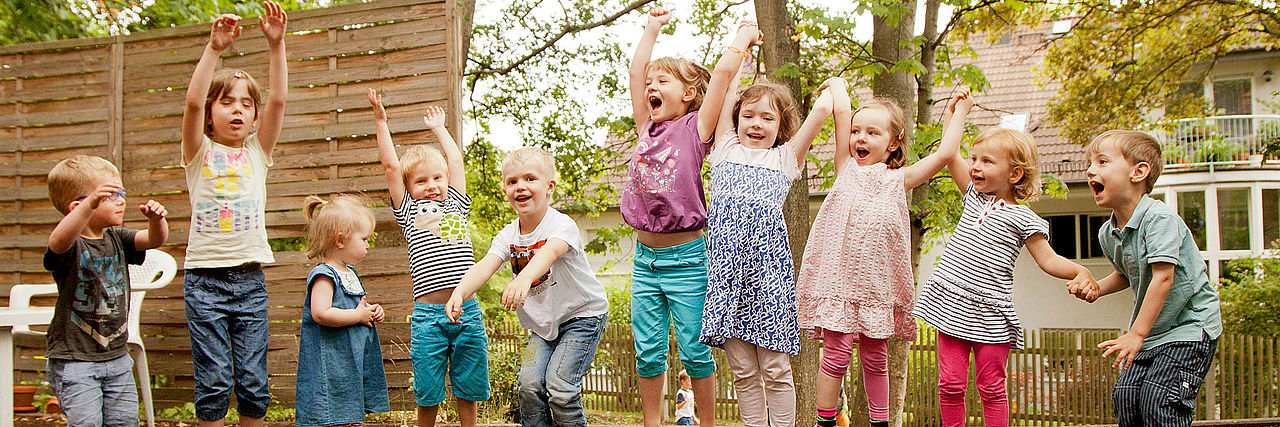 Im Garten gibt es viel Platz zum Fahren, Rennen, Fangen und Verstecken. Durch die großen Bäume ist es im Sommer schön schattig. Außerdem können die Kinder die Jahreszeiten hautnah miterleben und vielfältige Naturerfahrungen sammeln. Sie können schaukeln, rutschen, mit dem Roller oder Auto durch das Gelände rasen oder auf dem Trampolin springen, durch den Tunnel kriechen oder auf dem Barfusspfad balancieren. Mit nackten Füßen macht das besonders viel Spaß. Bäume und Klettergeräte ziehen die Bummis immer magisch an. Gern wird auch mit Kreide gemalt, Fußball gespielt und in der großen Sandfläche gebuddelt und gematscht. Herrlich ist es, auf der großen Tribüne ein Theaterstück zu verfolgen.Mit wem können die Kinder spielen?