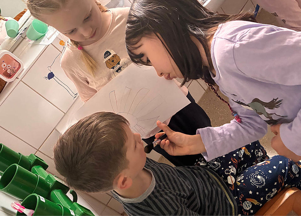 Neben dem kreativen Schminken stand vor allem das Wohlfühlen und Entspannen im Mittelpunkt. Die Kinder konnten sich gegenseitig im Spiegel bestaunen, neue Rollen ausprobieren und einfach einmal etwas ganz Besonderes erleben.