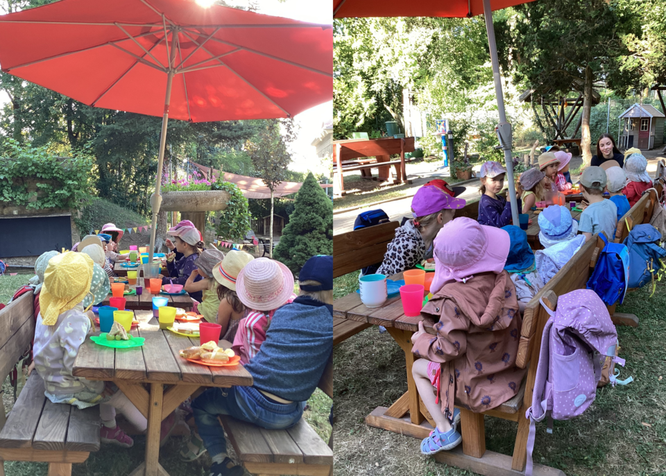 Um nicht der großen Hitze über die Mittagszeit und am Nachmittag ausgesetzt zu sein, haben wir das Frühstück nach draußen verlagert und die Freispielzeit im Garten nach vorn verlegt.
