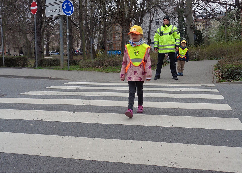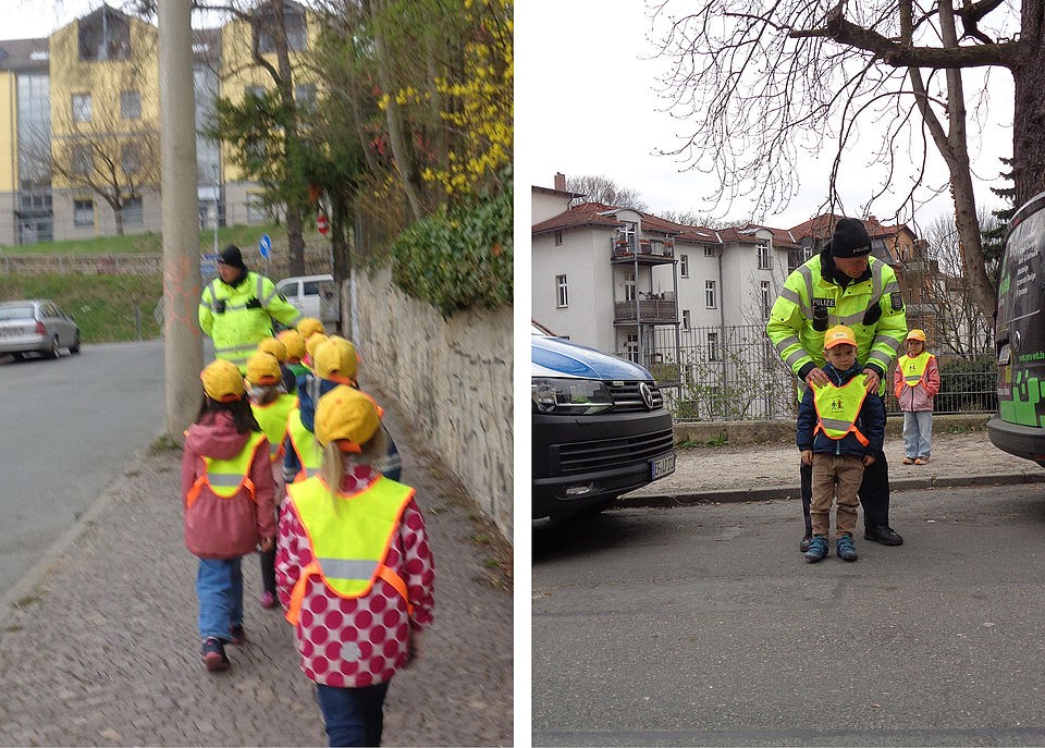 Deshalb lernen unsere zukünftigen Erstklässler mit Unterstützung der Polizei Jena, wie man sicher eine Straße überquert und worauf man auch als Fußgänger achten muss. Dies gibt Selbstsicherheit und ist ein wichtiger Schritt im Rahmen der Schulvorbereitung.