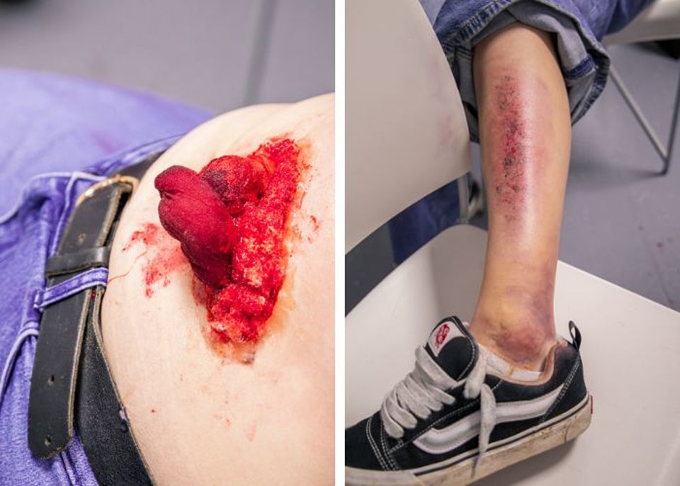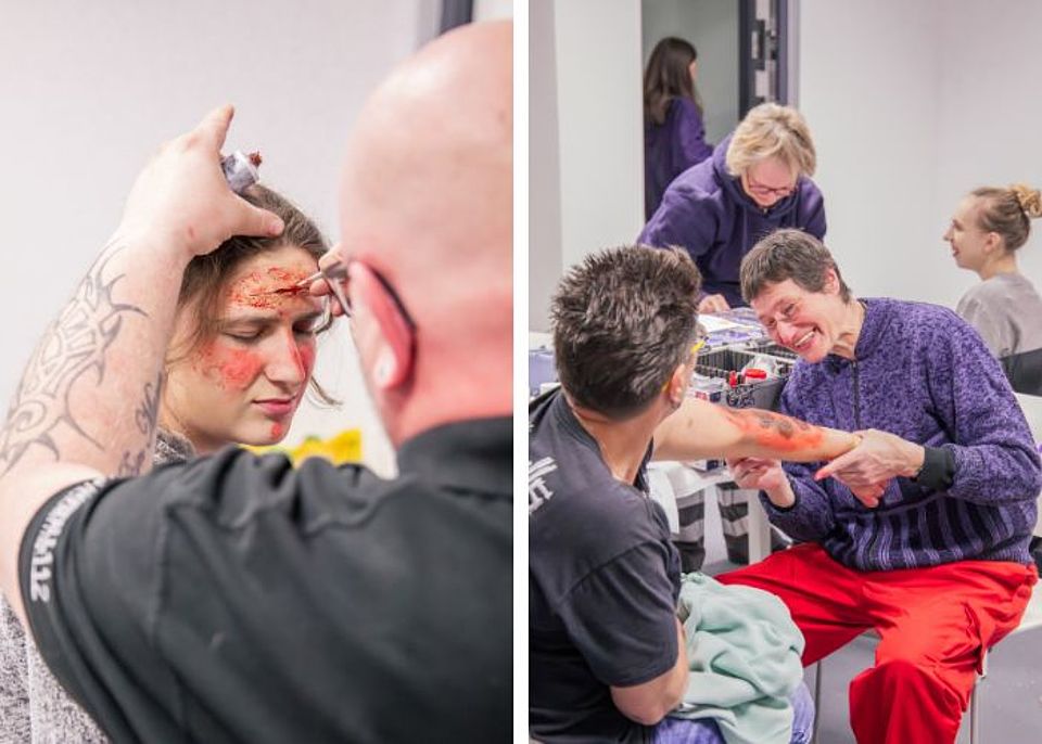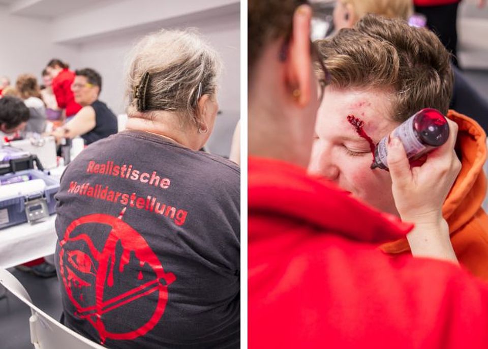 Die Einsatzkräfte wussten vorab nicht im Detail, was sie erwarten würde. Den Verletztendarstellern wurden unterschiedliche Verletzungsmuster zugewiesen, von leichten Schürfwunden und blutenden Verletzungen bis hin zu schweren Notfällen wie einer offenen Oberschenkelfraktur, einer Pfählungsverletzung, einem abgerissenen Finger oder einer schwangeren Verletzten. Professionelle Schminkerinnen und Schminker gestalteten die Mimen mit realistischen Verletzungsbildern.