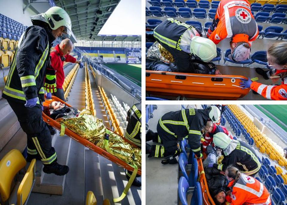 Das angenommene Szenario: Während der ersten Halbzeit kommt es zu Ausschreitungen zwischen Fangruppen. Pyrotechnik wird in andere Fanbereiche geworfen, in den Blöcken entstehen Brände und Aufruhr. Tränengas sorgt zusätzlich für Chaos. In der einsetzenden Panik stürzen mehrere Menschen, weitere erleiden Verbrennungen, Kopfverletzungen oder Augenreizungen.