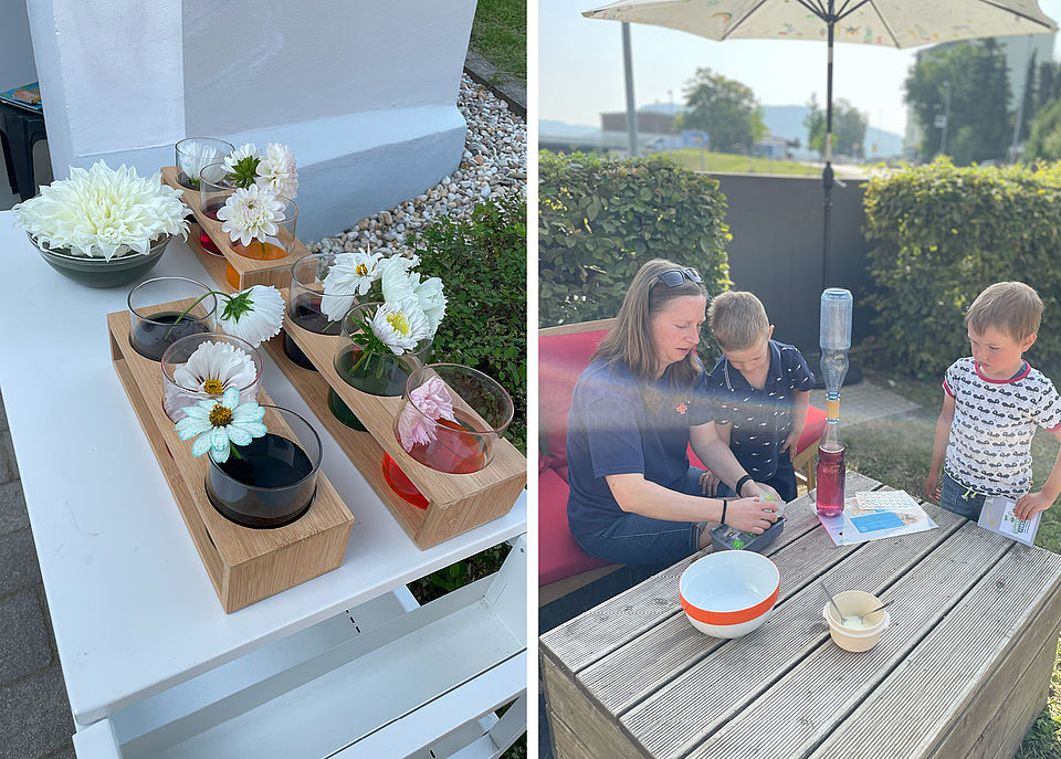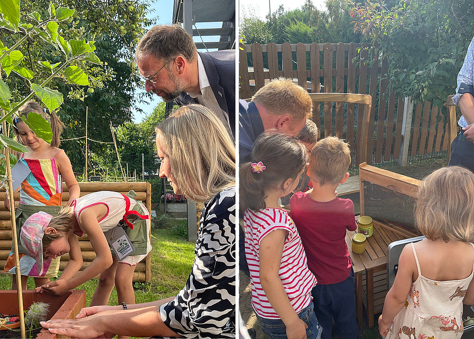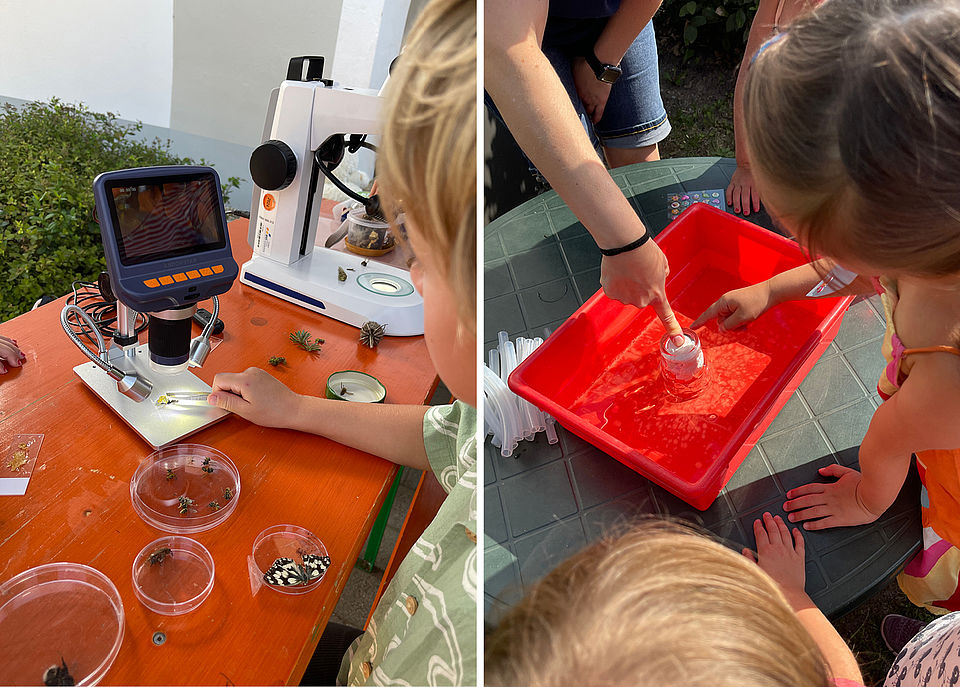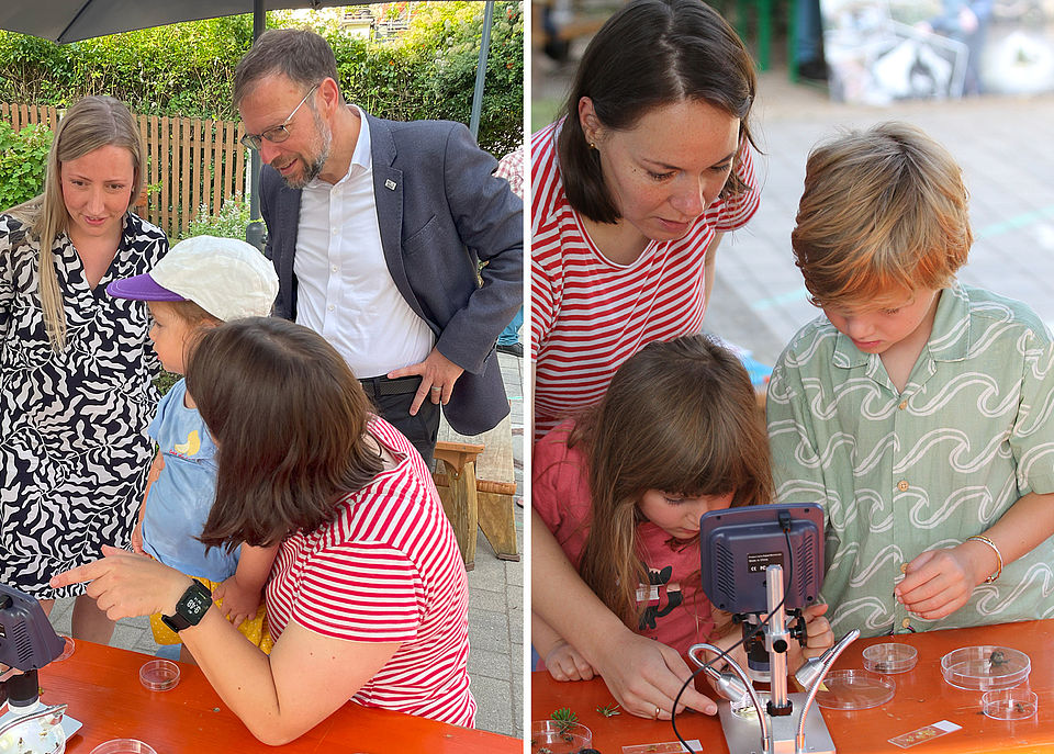 Nach dem offiziellen Teil folgte für die Gäste ein Rundgang durch die Einrichtung, bei dem sie die Kinder beim Forschen, Entdecken und Experimentieren erleben konnten. Das Kita-Team, Eltern und Kooperationspartner der Einrichtung hatten Stationen aufgebaut. Imkerei, Insekten unter dem Mikroskop, Wasserexperimente, das Leben in den Jenaer Fließgewässern und viele andere spannende Themen zogen Kinder und Gäste in ihren Bann.