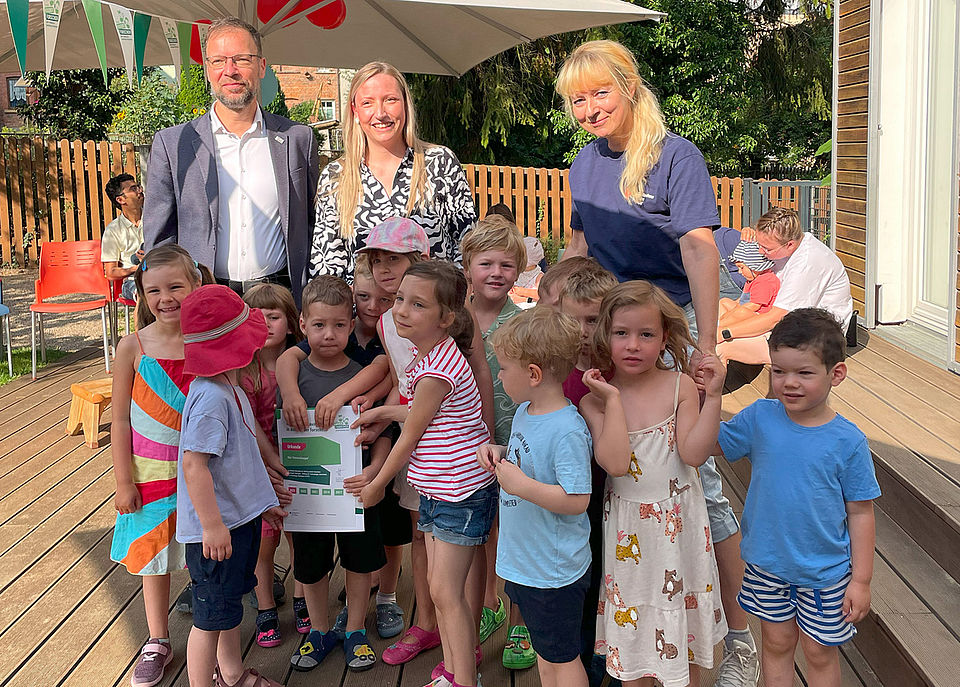 Im Anschluss überreichte Susanne Haun von MINT Thüringen die Urkunde zur Zertifizierung feierlich an die Kinder. Oberbürgermeister Dr. Thomas Nitzsche würdigte in seiner Ansprache das Engagement der Einrichtung: „Am Anfang steht das Staunen. Wenn daraus Neugier wächst, Kinder Fragen stellen und eigene Experimente wagen, dann ist das der Moment, in dem echtes Lernen beginnt – und wir gemeinsam entdecken, was sich daraus ableiten lässt. Das ist wirklich schön.“