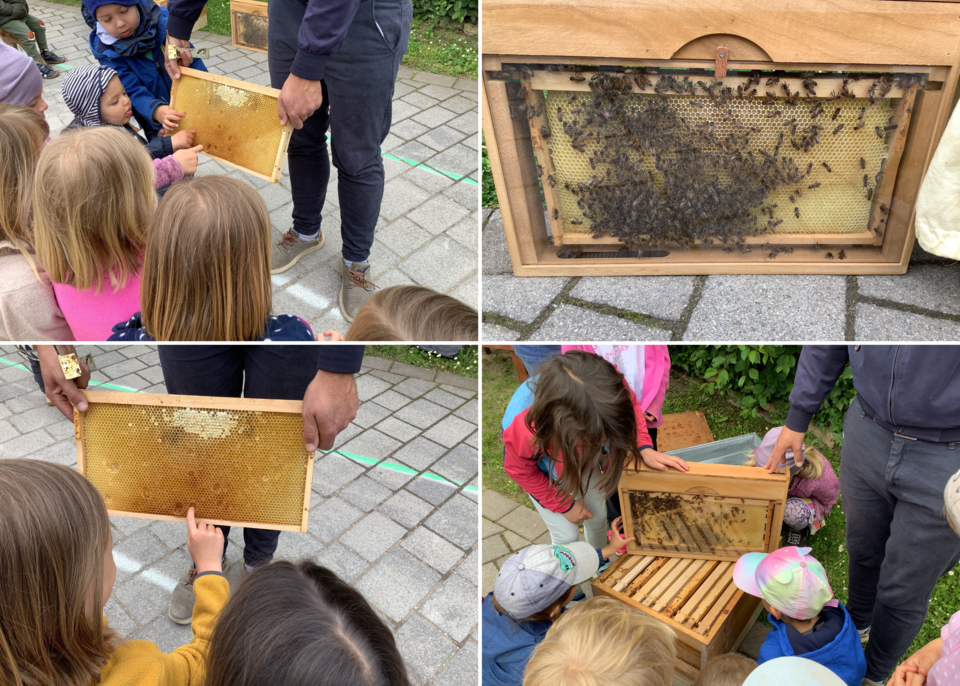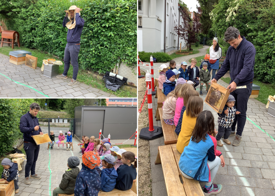 Wie toll, wenn Eltern Ihre Begeisterung über besondere Interessen mit unseren Kindern teilen. Herr Bermig ist in seiner Freizeit Imker und hat die Sternschnuppenkinder mit in seine Welt genommen. Er ließ sie einen ganzen Vormittag forschen und entdecken. Wie schützt sich der Imker? Wie lebt ein Bienenvolk? Was hat es mit der Königin auf sich? Wie schmeckt der Honig aus der Wabe? Wie schützen wir die kleinen Tiere? Auf alles gab es eine Antwort. Die Kinder waren neugierig, probierten alles aus und sind nun begeistert von diesen wertvollen Insekten. Tausend Dank an Sven Bermig für die spannenden Eindrücke!