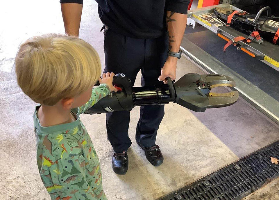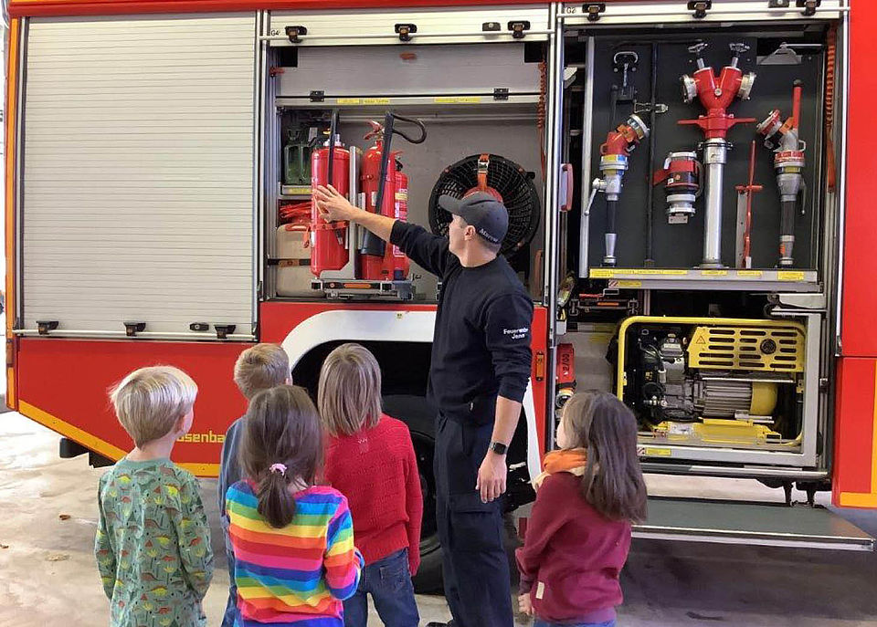 Zum Schluss ging es in die große Fahrzeughalle. Dort stehen die verschiedenen Einsatzfahrzeuge. Markus hat gezeigt, was sich hinter den ganzen Klappen am Feuerwehrauto verbirgt: Schläuche, Feuerlöscher und verschiedenste Werkzeuge. Einige davon durften sich die Kinder näher anschauen und sogar kurz ausprobieren- z.B. eine Zange, mit der Stahl geschnitten werden kann. Die war so schwer, dass sie keiner der jungen Besucher anheben konnte.