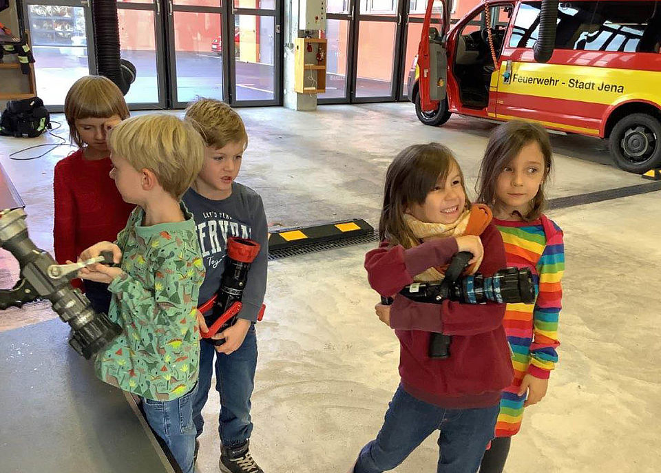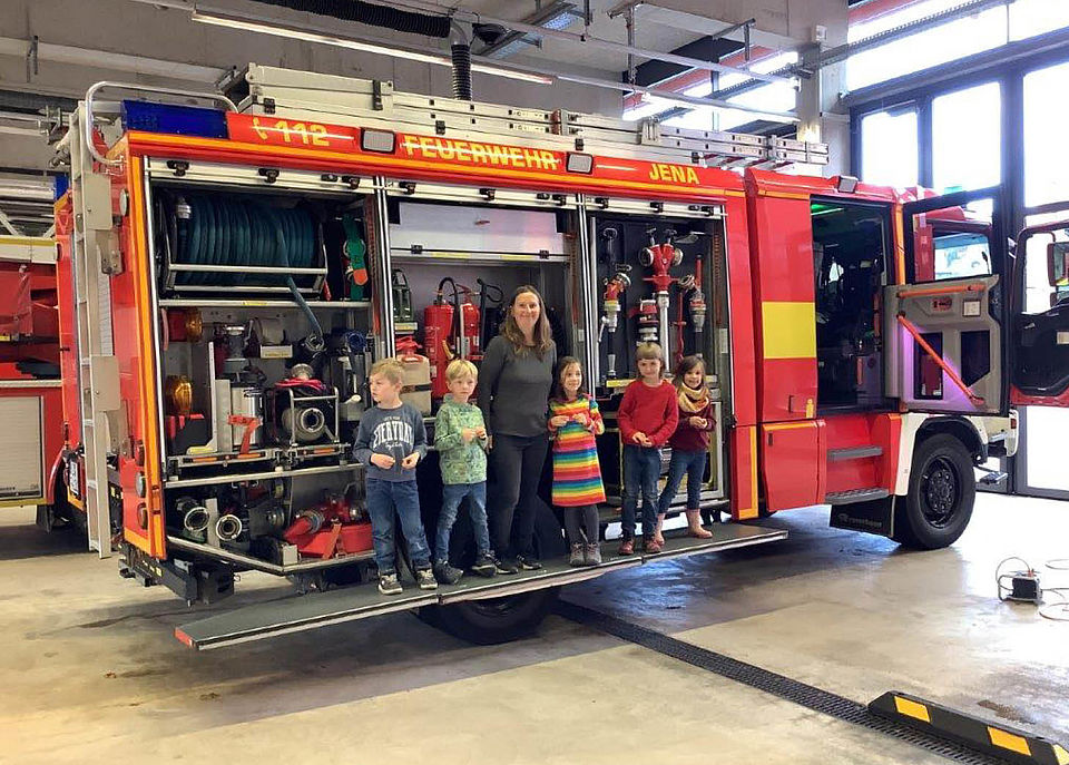 Die Feuerwehr rettet Leben. Ganz wichtig ist es, gut über deren Arbeit Bescheid zu wissen. Am 21. Oktober durften unsere Vorschulkinder sich in der Feuerwache Jena alles genau erklären lassen. Feuerwehrmann Markus führte die Sternschnuppenkinder durch die Einsatzstelle und beantwortete Unmengen Fragen.