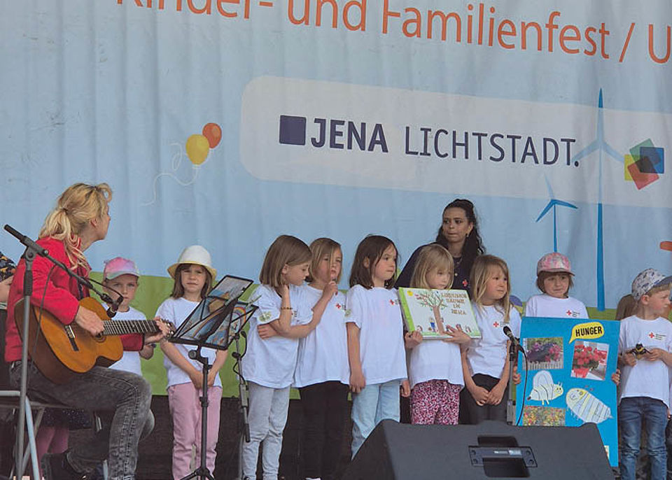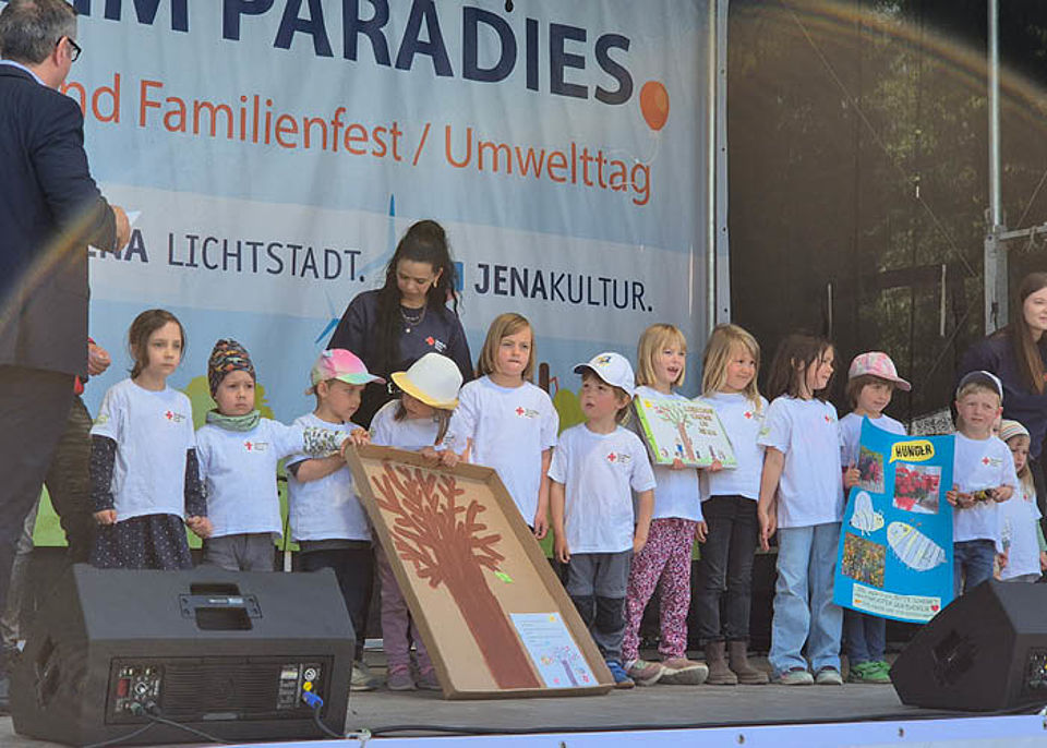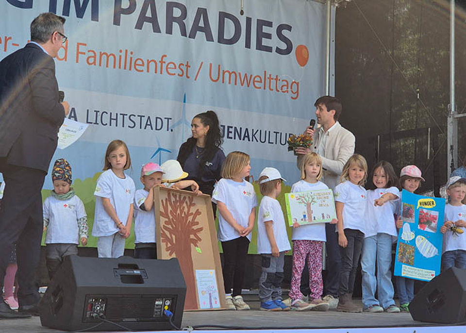 Die Kinder hatten unglaublich viele Aktionen zum Thema „Baum“ gestartet. Team und Kinder haben im Projektzeitraum selbst viel gelernt und trugen das Wissen und ihre Umweltschutz-Ideen an die Jenaer Bevölkerung. Wir sind sehr stolz, dass wir den 3. Platz erhielten. Am 24. Mai holten wir uns den Preis beim Tag im Paradies auf der großen Bühne ab. Viele Sternschnuppen-Kinder und Eltern waren dabei. Ganz klar für das Team war, dass es sich lohnt, zu unserem Projektthema dort einen Stand anzubieten. Und so war es auch: Jenas Kinder konnten bei uns das Fotosynthesespiel absolvieren, den Legekreis „Nadelbäume“ zusammenpuzzeln und ihr Geschick beim Kiefer- und Fichtezapfenzielwurf beweisen. Uns hat das richtig viel Spaß gemacht: Der Stand war sehr gut besucht und wir haben vielen Interessierten unsere Projektinhalte noch einmal nahegebracht.