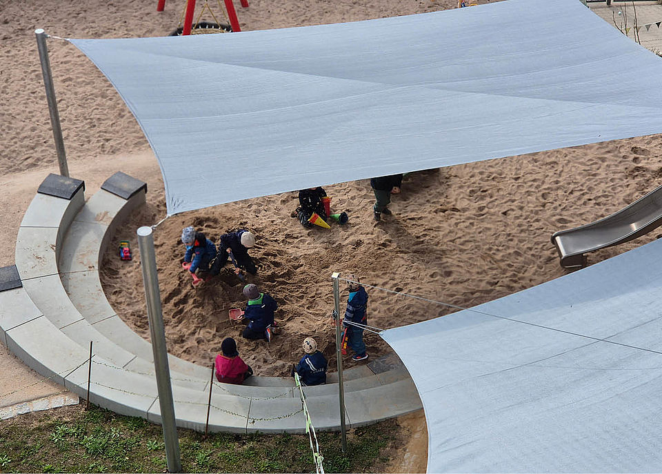 Die Kindertagesstätte ist erst im letzten Drittel des Jahres 2025 an ihren neuen Standort umgezogen. Mit der Installation des Sonnensegels wird nun auch die Außengestaltung des Geländes vervollständigt, sodass den Kindern ein rundum gut ausgestatteter und sicherer Außenbereich zur Verfügung steht.