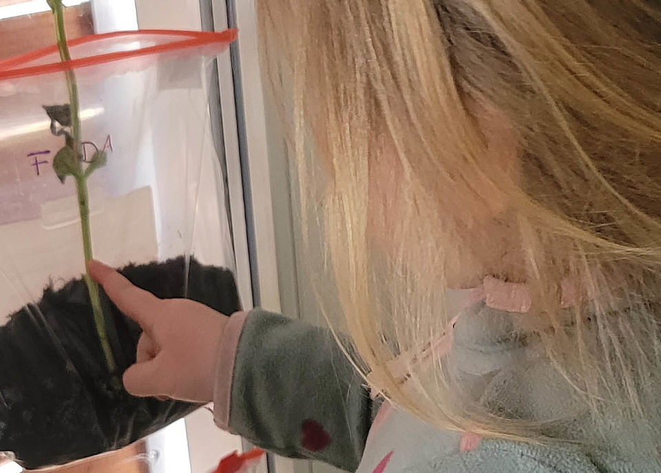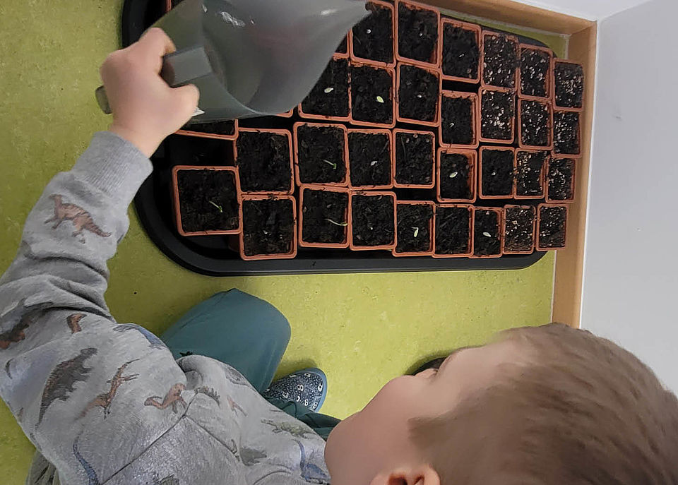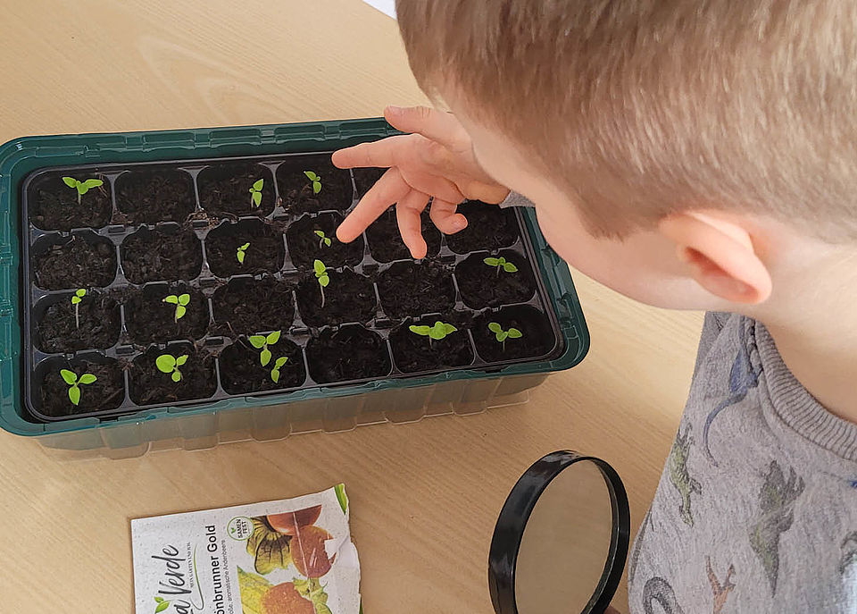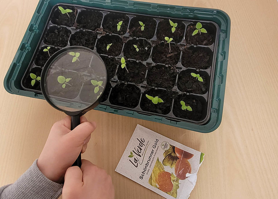 Am Fenster sprießen zur hautnahen Beobachtung bereits seit Januar die persönlichen Puffbohnen der jungen Gärtner. Außerdem gedeihen schon die ersten Physalis-, Gurken- und Tomatenpflänzchen.