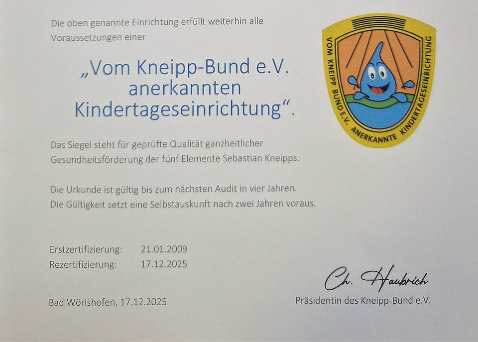Somit können wir auch weiterhin als zertifizierte Kneippeinrichtung arbeiten und die fünf Säulen nach Sebastian Kneipp in unseren Kita-Alltag einbringen.