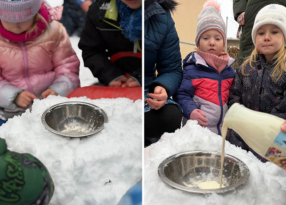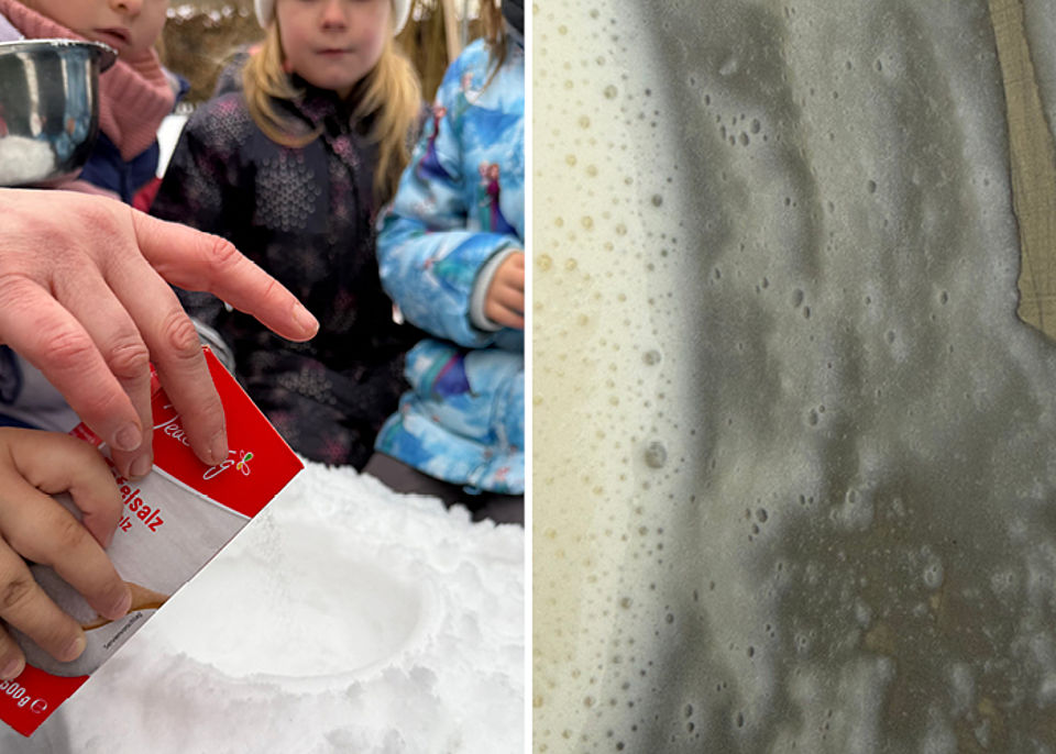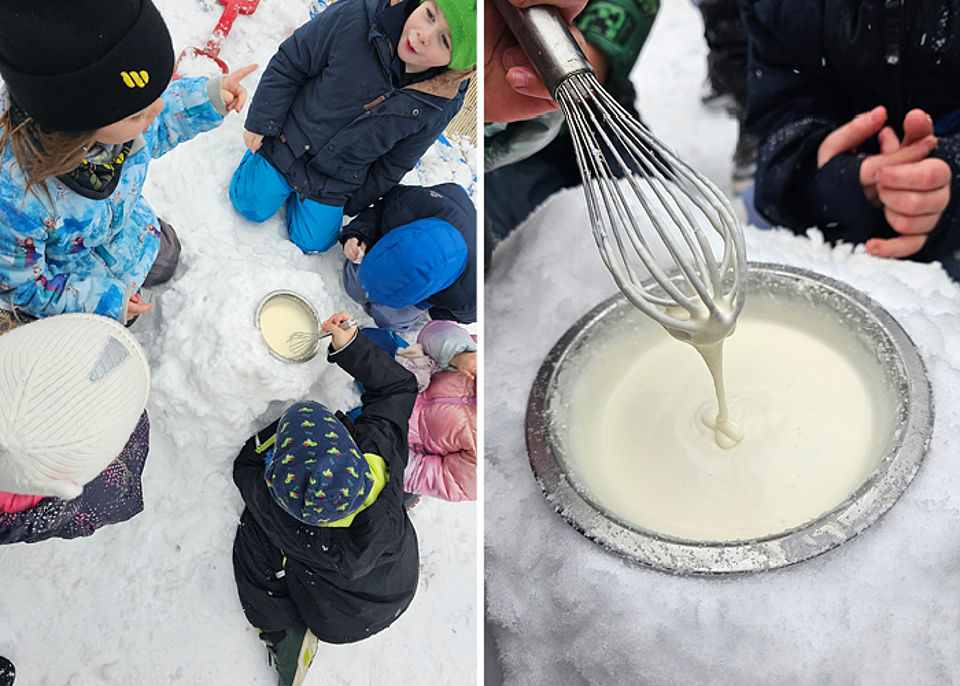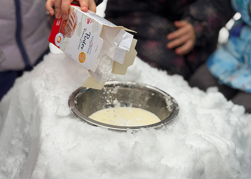 Wer es wie unsere Kinder probieren möchte, formt mit der Metallschüssel eine Mulde in den Schnee und schüttet reichlich Salz hinein. Das erhöht den Kälteeffekt. Sahne, Vanillezucker und Puderzucker kommen in die Schüssel, die Schüssel in die Mulde. Und dann wird gaaaaaaaaaanz lange gerührt. Geduld wird belohnt: nach ca. 30 Minuten gibt es leckeres Eis! Unseren Kindern hat es richtig gut geschmeckt.