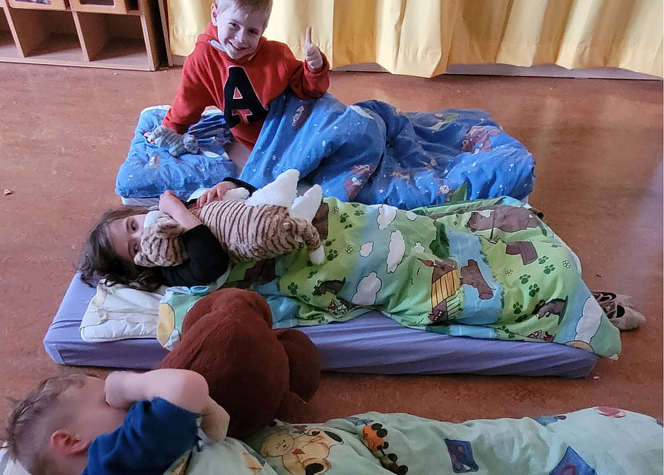 Die schicken Polsterliegen und Nestchen-Betten wurden getestet und für bequem befunden. In unserer Kita findet das Ruhen und Schlafen bedürfnisorientiert statt. Selbstverständlich gibt es bei uns keinen Schlafzwang: Müde Kinder dürfen schlafen und erfahren dabei eine liebevolle Begleitung durch unsere Fachkräfte. Das Vorlesen ist hier ein festes Ritual. Kinder, die nicht müde sind, erhalten alternative Ruhemöglichkeiten. Richtig toll finden unsere Kinder, dass sie nun nach dem Ausruhen vollkommen selbstständig die Liegen und das Bettzeug wieder im Schrank verstauen können. Wir freuen uns.