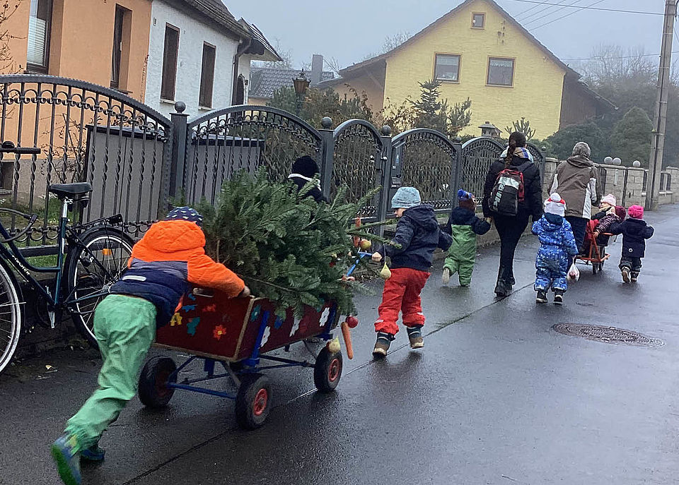 Ganz viel Kraft braucht es, den Wagen mit dem Baum bis zum Wald zu ziehen. Aber gemeinsam schaffen wir das!