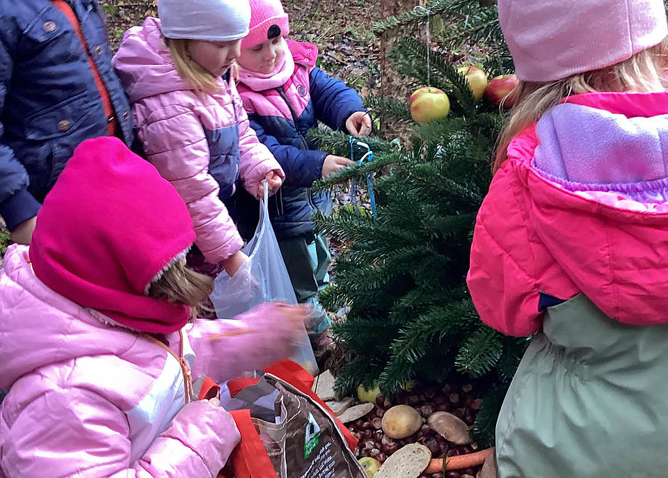Jedes Jahr im Dezember denken unsere Kinder an die Tiere des Waldes. Auch sie sollen ein schönes Weihnachtsfest erleben. Und so bitten wir dann unsere Familien um Obst und Gemüsespenden, mit denen wir ein Weihnachtsbäumchen schmücken.