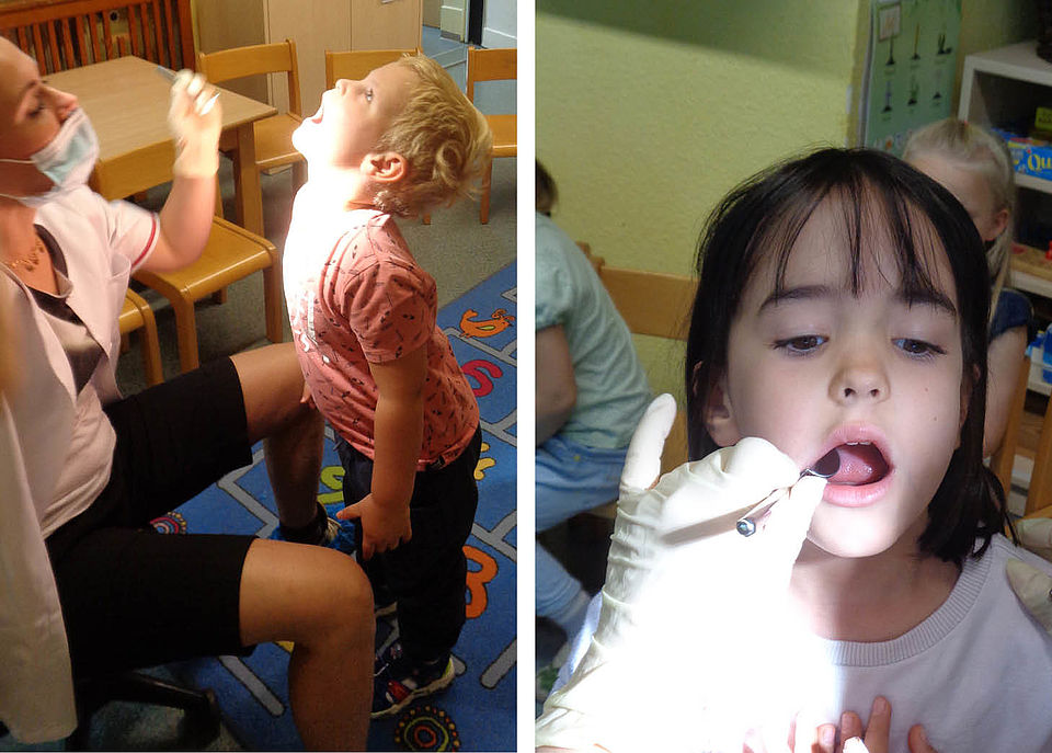 In der vertrauten Umgebung des Kindergartens konnte die Zahnärztin Frau Dr. Mehls vom Gesundheitsamt in Jena heute einen wichtigen Grundstein für lebenslang gesunde Zähne legen. Durch den Besuch der Zahnärztin können frühzeitig Karies oder Zahnprobleme erkannt werden. Ihr Maskottchen, der Dino, nahm den Kindern die Angst vor der Zahnärztin und so wird dieser Besuch positiv in den Köpfen der Kinder bleiben.