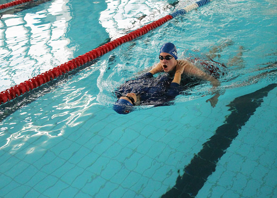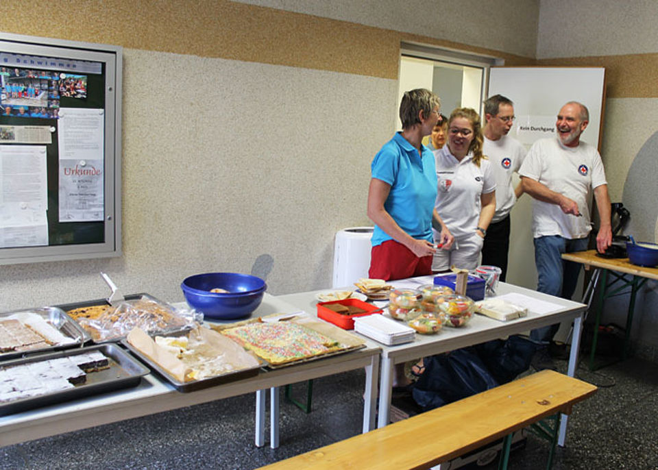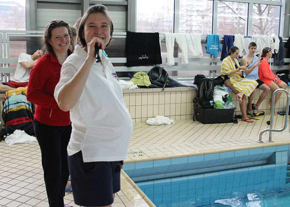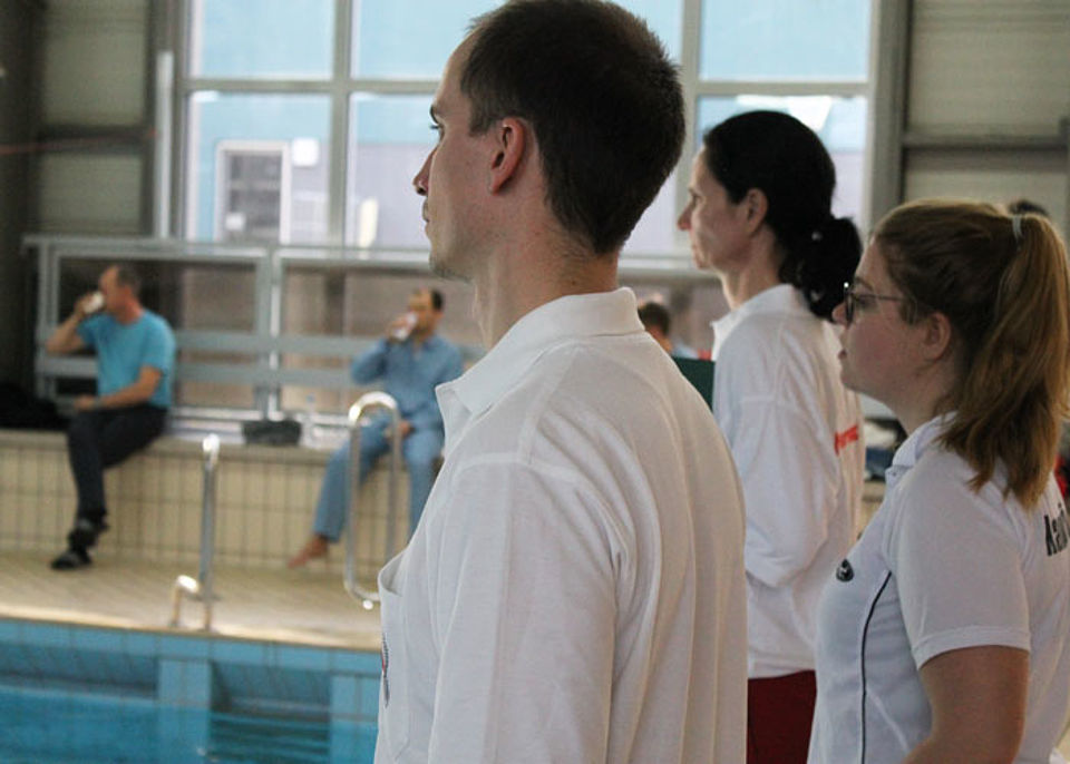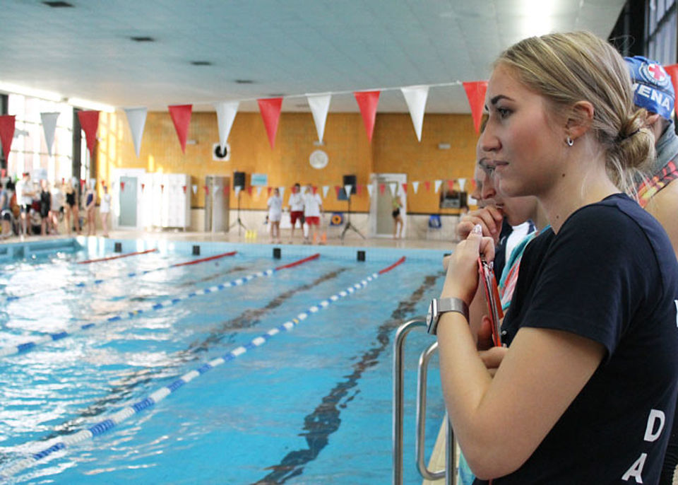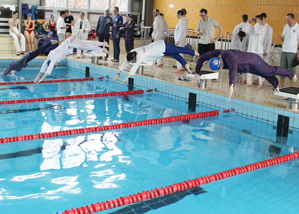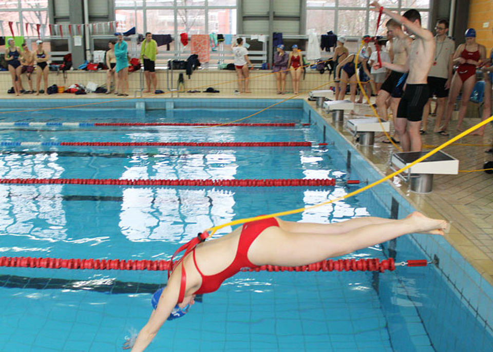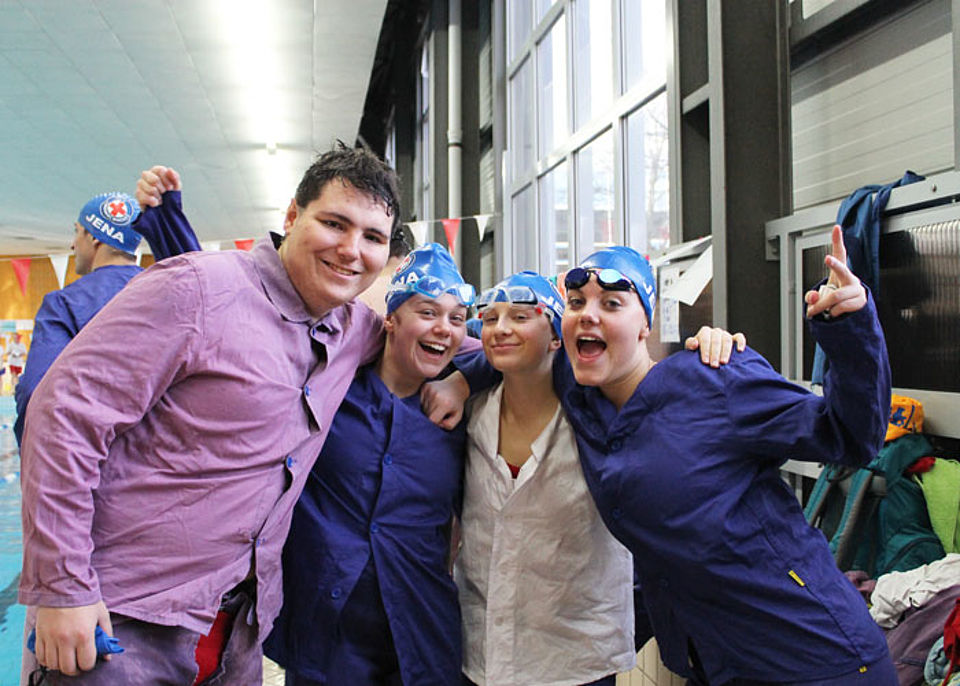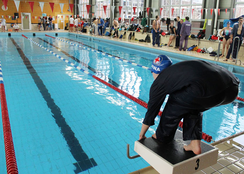 Am Start des 14. Jenapokals waren drei Damen-, drei Herren- und sieben gemischte Mannschaften sowie zwei Junioren-Teams und drei Paare. In sechs Disziplinen - darunter einer kreativen Jahreszeitenstaffel - traten die Mannschaften, gut vorbereitet und unterstützt durch laute Anfeuerungsrufe, gegeneinander an. Die Teilnehmer mussten nicht nur schwimmen, sondern auch tauchen und Mannschaftskameraden durchs Wasser schleppen. Und dabei hatten sie immer die Uhr bzw. die Konkurrenz im Blick. Jede Menge Schieds- und Kampfrichter mit Listen, Stoppuhren und Trillerpfeifen säumten das 25m-Becken und achteten auf die Zeit, den korrekten Richtungswechsel und den Schwimmstil.